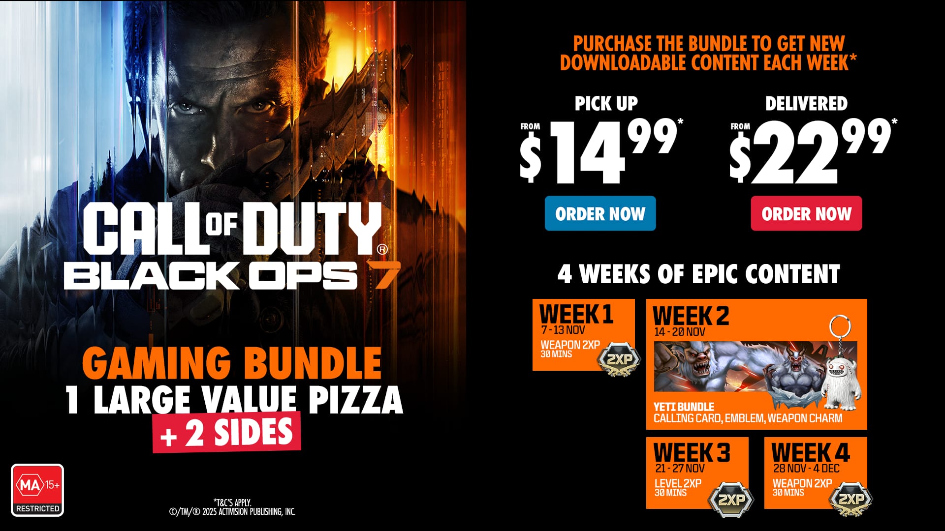 b. The Domino’s x Call of Duty 1 + 2 Bundle consists of one (1) Large Value Pizza and two (2) sides, available for Pick Up or Delivery and offered online only via the Domino’s App or website. Conditions apply. Domino’s x Call of Duty 1 + 2 Bundle includes a Large Value Range Pizza and Garlic Bread or 1.25L drink varieties as sides. Customisation and upgrades may incur additional charges.