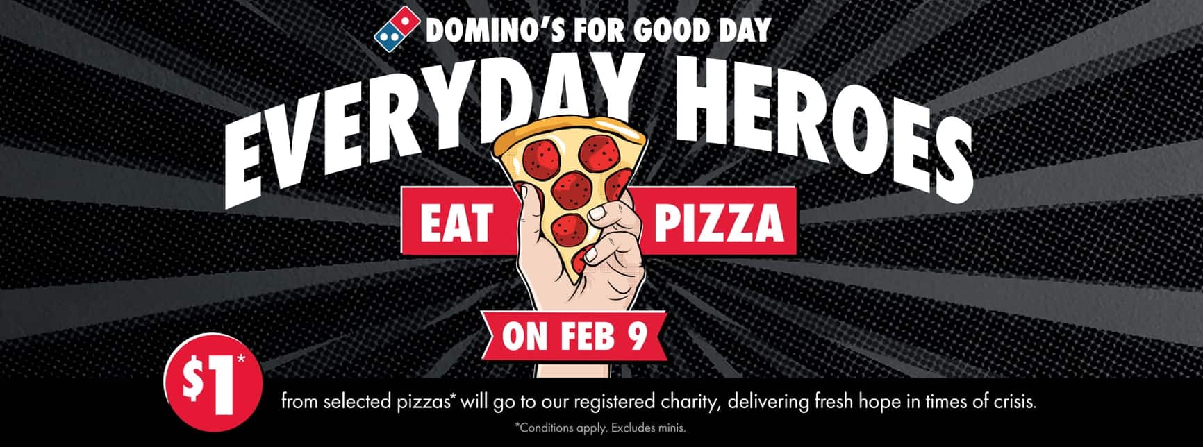 Held annually on 9 February, also known as World Pizza Day, Domino’s for Good Day sees Domino's Pizza Australia and its franchise partners come together for a good cause, donating $1 from every pizza* and 10c from every drink* sold to Minds & Meals.