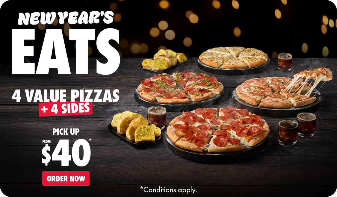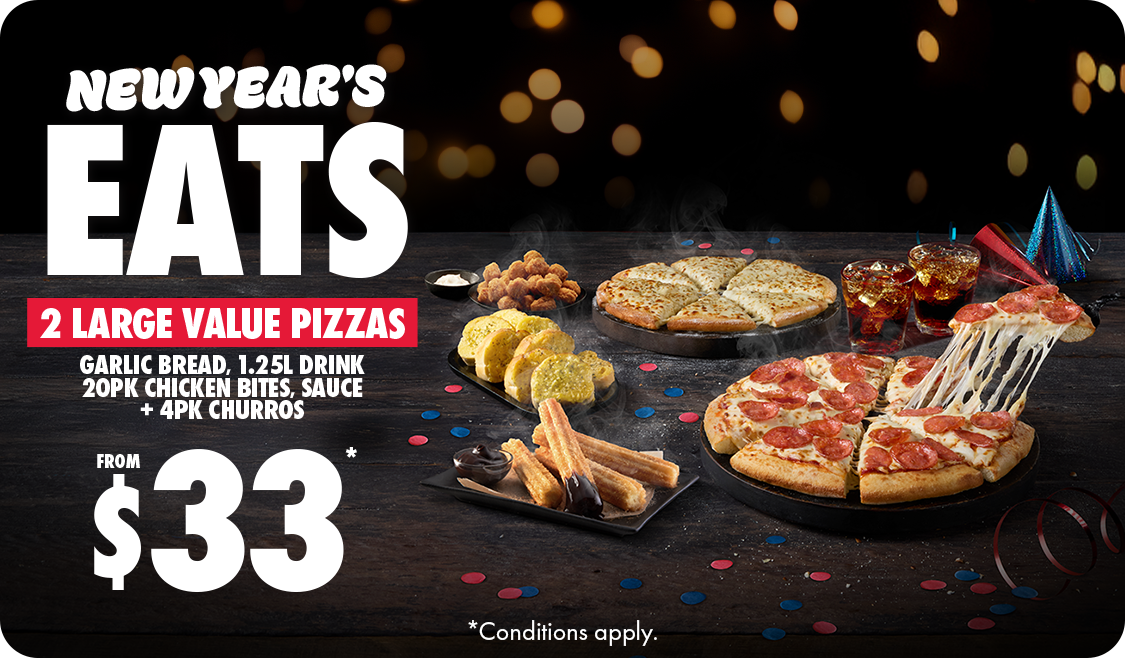 *Conditions apply. Deal includes Large Value Range pizzas and Garlic Bread or 1.25L drink varieties as sides. Customisation may incur additional charges. Can be upgraded for additional costs. Offer available online at participating stores. 10% surcharge on Sundays and after 10pm. Up to 20% surcharge on public holidays. Minimum delivery order up to $22.90.