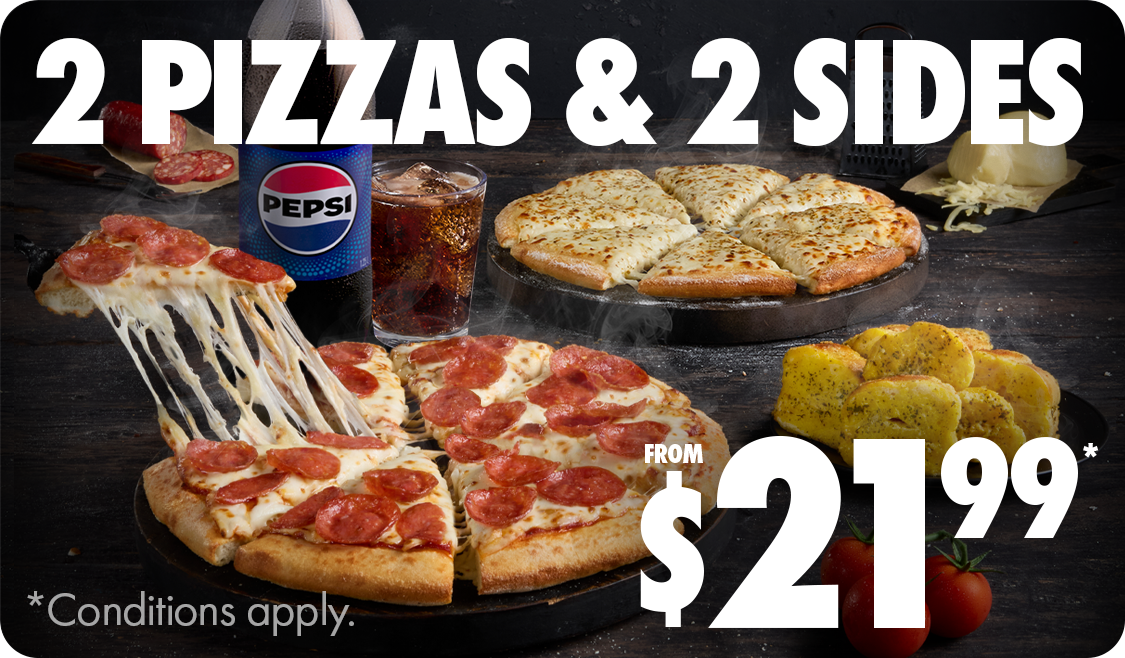 *Conditions apply. Deal includes Large Value Range pizzas and Garlic Bread or 1.25L drink varieties as sides. Customisation may incur additional charges. Can be upgraded for additional costs. Offer available online at participating stores. 10% surcharge on Sundays and after 10pm. Up to 20% surcharge on public holidays. Minimum delivery order up to $22.90. Valid until 30/09/2025-pending from Jodie.