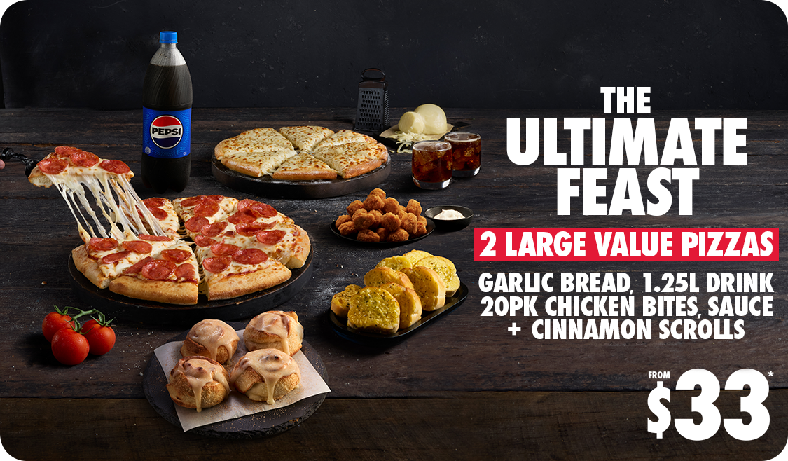*Conditions apply. Deal includes 2 Large Value Pizzas + Garlic Bread, 1.25L Drink, 20pk Chicken Bites, Dipping Sauce & Cinnamon Scrolls. Customisation may incur additional charges. Can be upgraded for additional costs. Offer available online at participating stores. 10% surcharge on Sundays and after 10pm. Up to 20% surcharge on public holidays. Minimum delivery order up to $22.90.