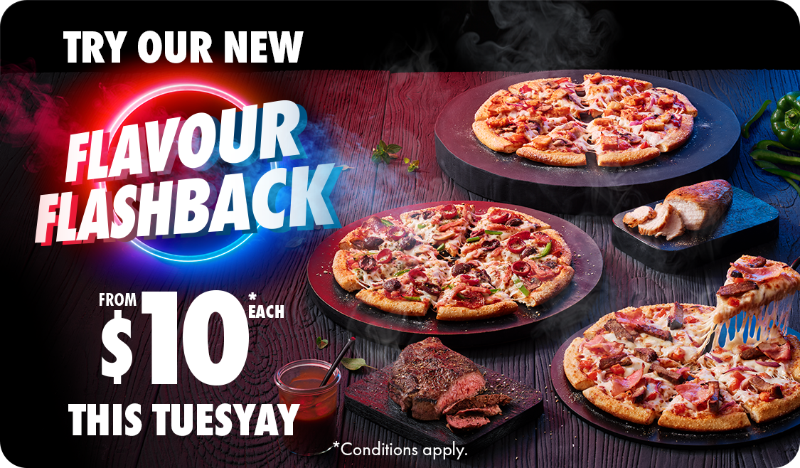 *Conditions apply. Valid Tuesday only at participating stores for selected Large Pizzas only. Excludes Half ’n’ Half Pizzas. Minimum delivery order $16. Delivery offer excludes Value Range. Customisation will incur additional charges. 10% surcharge after 10pm in selected stores. Up to 20% surcharge on public holidays.