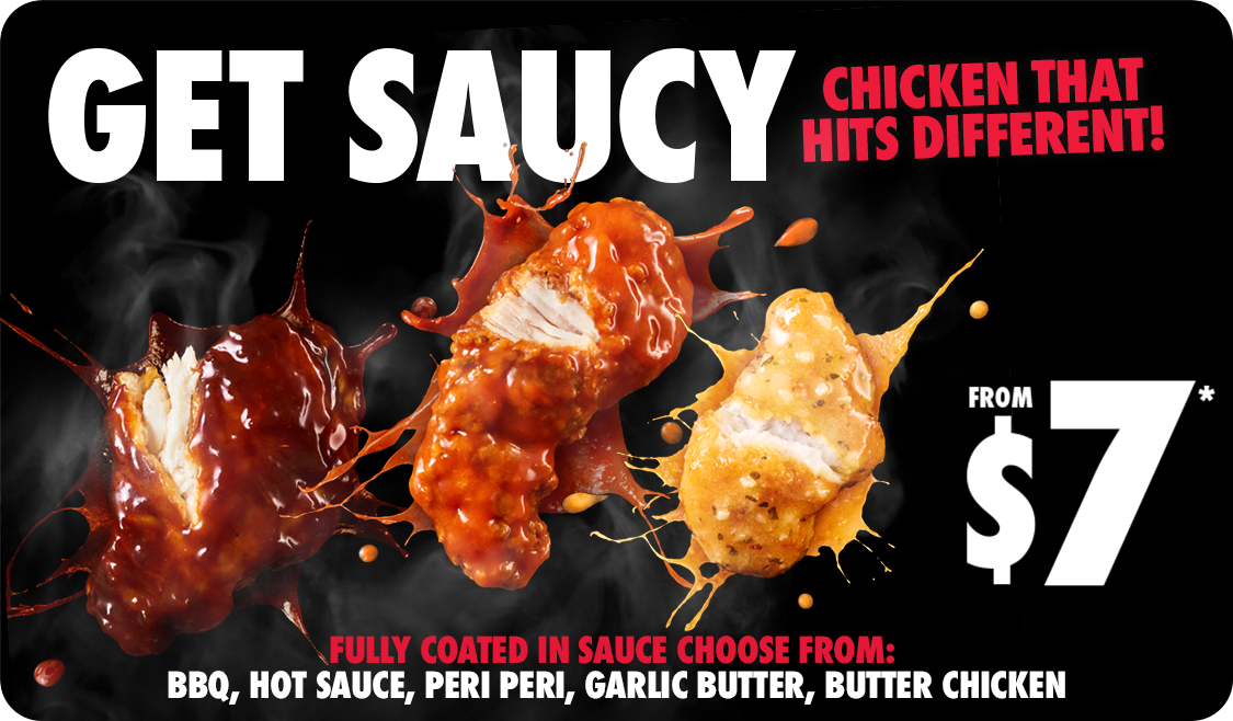 *Conditions apply. Saucy Chicken Nuggets from $7. Valid for a limited time only. Customisation may incur additional charges. Offer available online at participating stores. 10% surcharge on Sundays and after 10pm. Up to 20% surcharge on public holidays. Minimum delivery order up to $22.90.