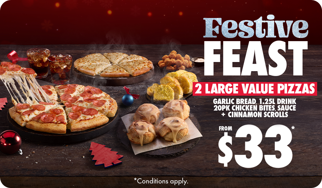 *Conditions apply. Deal includes 2 Large Value Pizzas + Garlic Bread, 1.25L Drink, 20pk Chicken Bites, Dipping Sauce & Cinnamon Scrolls. Customisation may incur additional charges. Can be upgraded for additional costs. Offer available online at participating stores. 10% surcharge on Sundays and after 10pm. Up to 20% surcharge on public holidays. Minimum delivery order up to $22.90.