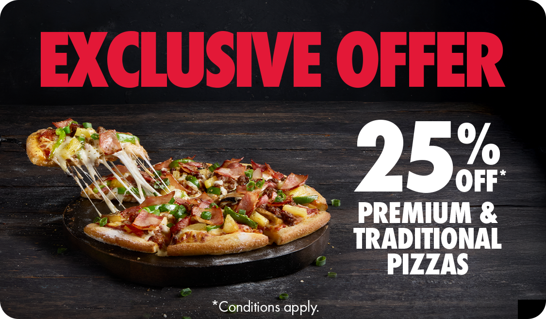 *Conditions apply. Buy 1 large menu priced pizza and get 1 large pizza for 50% off. Delivery only. Available online for a limited time at participating stores. Customisation may incur additional charges. 10% surcharge after 10pm. Up to 20% surcharge on public holidays.