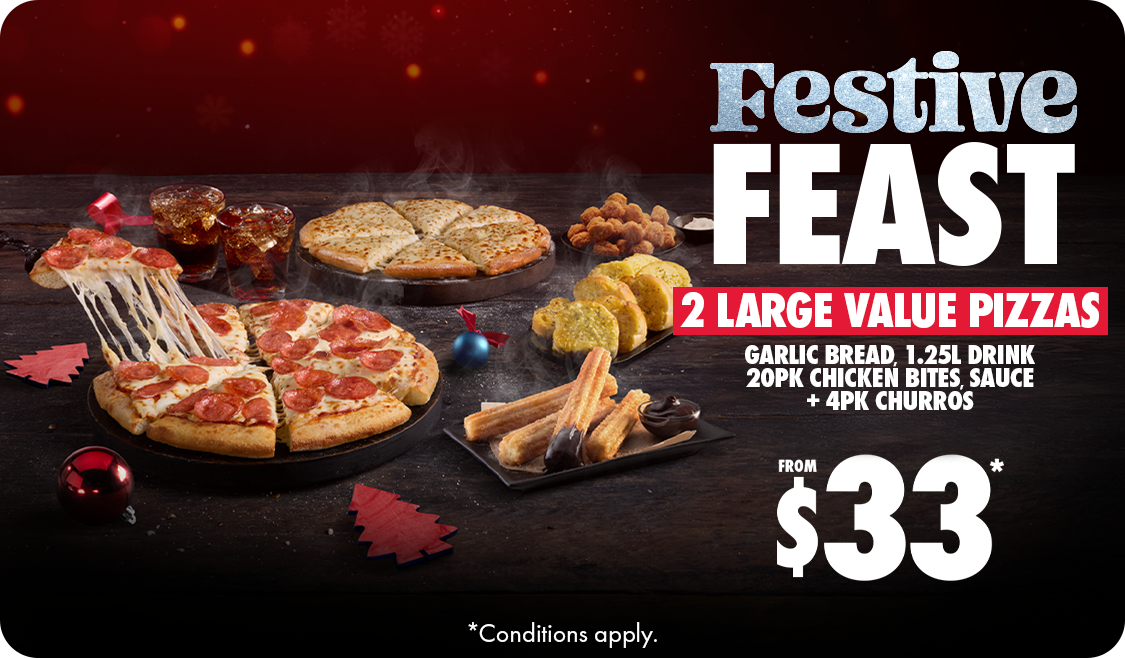 *Conditions apply. Deal includes 2 Large Value Pizzas + Garlic Bread, 1.25L Drink, 20pk Chicken Bites, Dipping Sauce & 4pk churros. Customisation may incur additional charges. Can be upgraded for additional costs. Offer available online at participating stores. 10% surcharge on Sundays and after 10pm. Up to 20% surcharge on public holidays. Minimum delivery order up to $22.90.