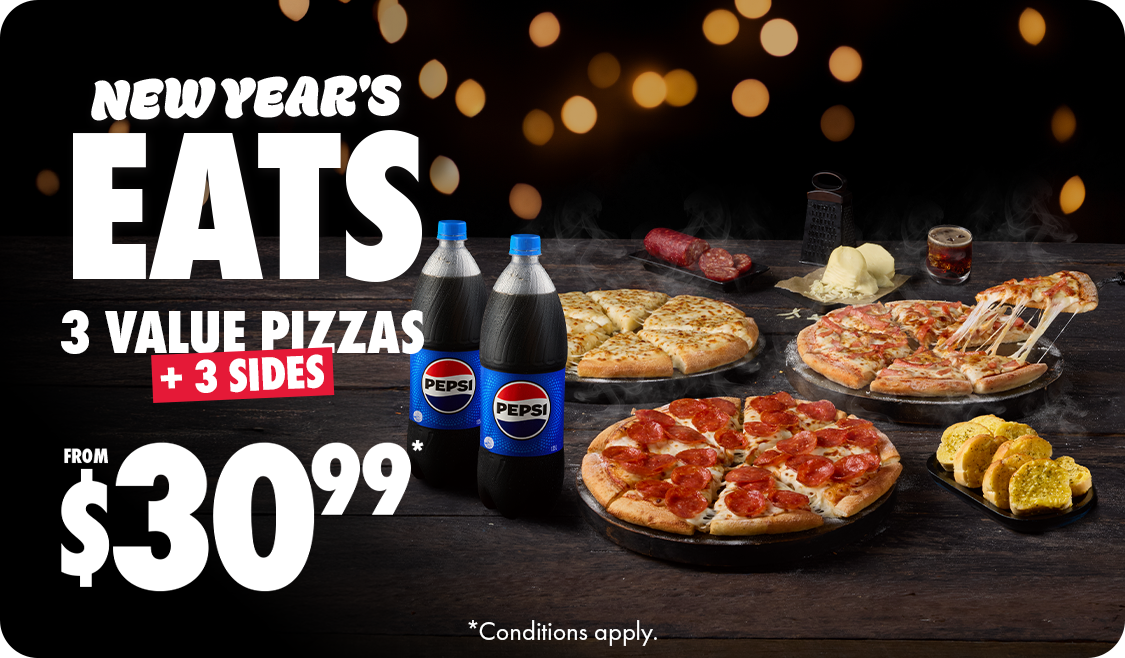 *Conditions apply. Deal includes Large Value Range pizzas and Garlic Bread or 1.25L drink varieties as sides. Customisation may incur additional charges. Can be upgraded for additional costs. Offer available online only. Selected stores only. 10% surcharge on Sundays and after 10pm. Up to 20% surcharge on public holidays. Minimum delivery order up to $22.90.
