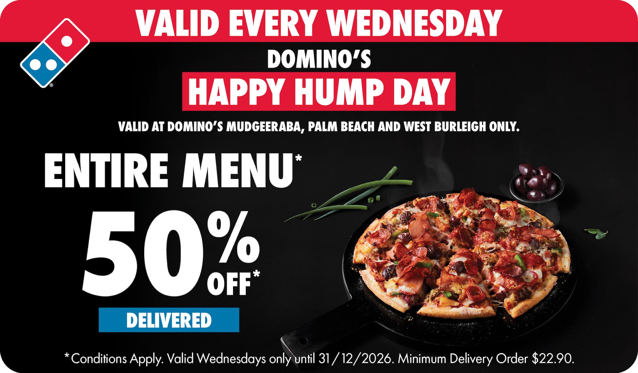 *10% surcharge applies on Sundays and after 10pm in selected stores. Surcharge of up to 20% applies on Public Holidays. Minimum delivery order $22.90 (excluding extended delivery, after 10pm, Sunday, and Public Holiday surcharges). Additional charges apply for extra toppings, half 'n' half & indulgent crusts. Limited area for delivery. For full terms and conditions click here.