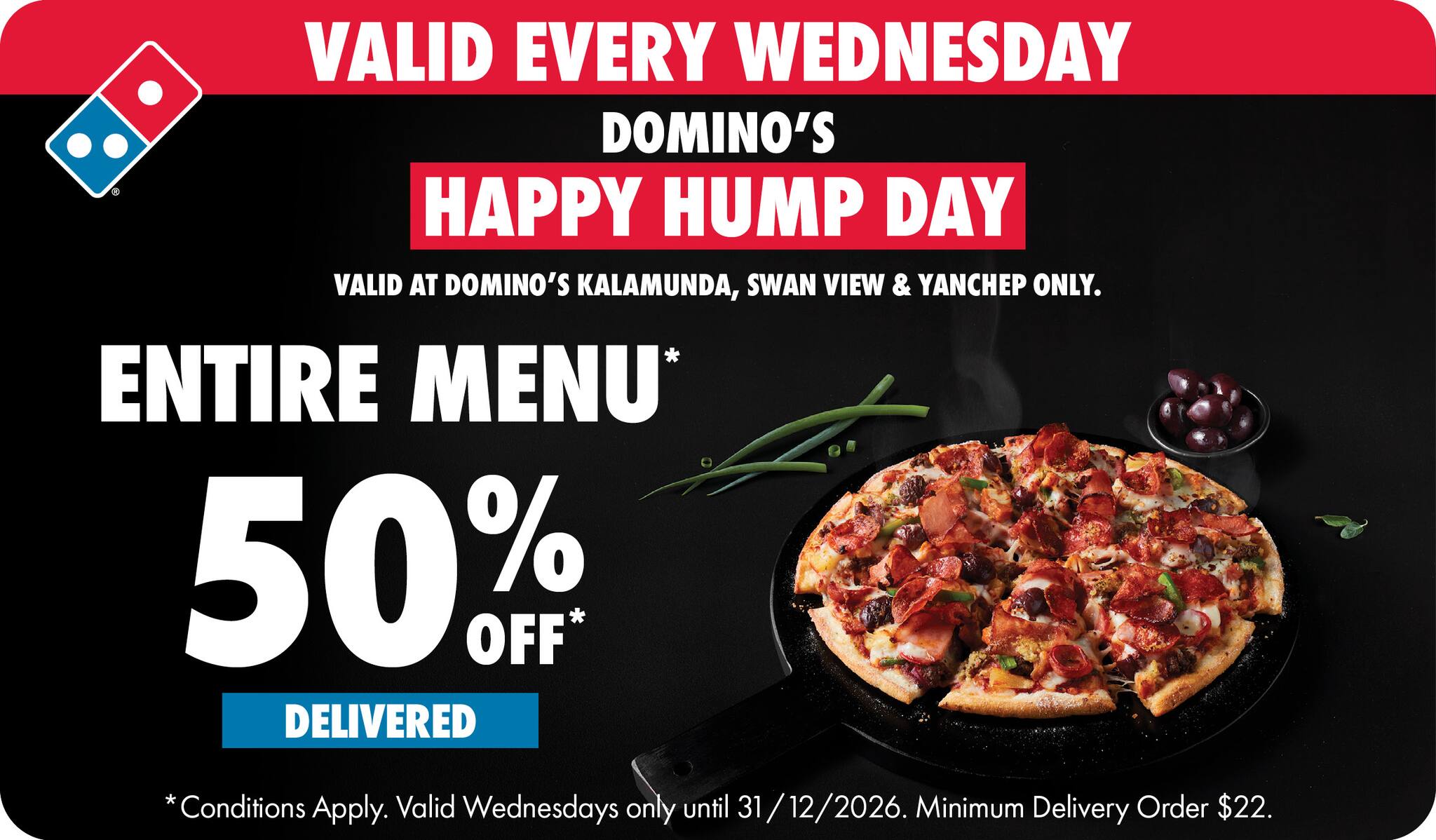 *10% surcharge applies on Sundays and after 10pm in selected stores. Surcharge of up to 20% applies on Public Holidays. Minimum delivery order $22.90 (excluding extended delivery, after 10pm, Sunday, and Public Holiday surcharges). Additional charges apply for extra toppings, half 'n' half & indulgent crusts. Limited area for delivery. For full terms and conditions click here.