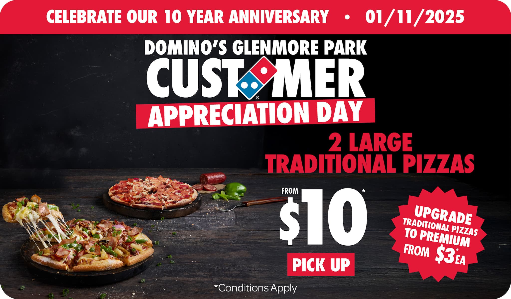 *10% surcharge applies on Sundays and after 10pm in selected stores. Surcharge of up to 20% applies on Public Holidays. Minimum delivery order $22.90 (excluding extended delivery, after 10pm, Sunday, and Public Holiday surcharges). Additional charges apply for extra toppings, half 'n' half & indulgent crusts. Limited area for delivery. For full terms and conditions click here.