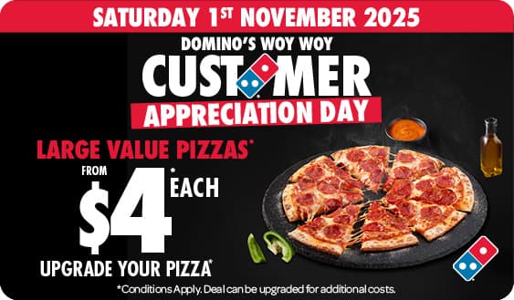*10% surcharge applies on Sundays and after 10pm in selected stores. Surcharge of up to 20% applies on Public Holidays. Minimum delivery order $22.90 (excluding extended delivery, after 10pm, Sunday, and Public Holiday surcharges). Additional charges apply for extra toppings, half 'n' half & indulgent crusts. Limited area for delivery. For full terms and conditions click here.