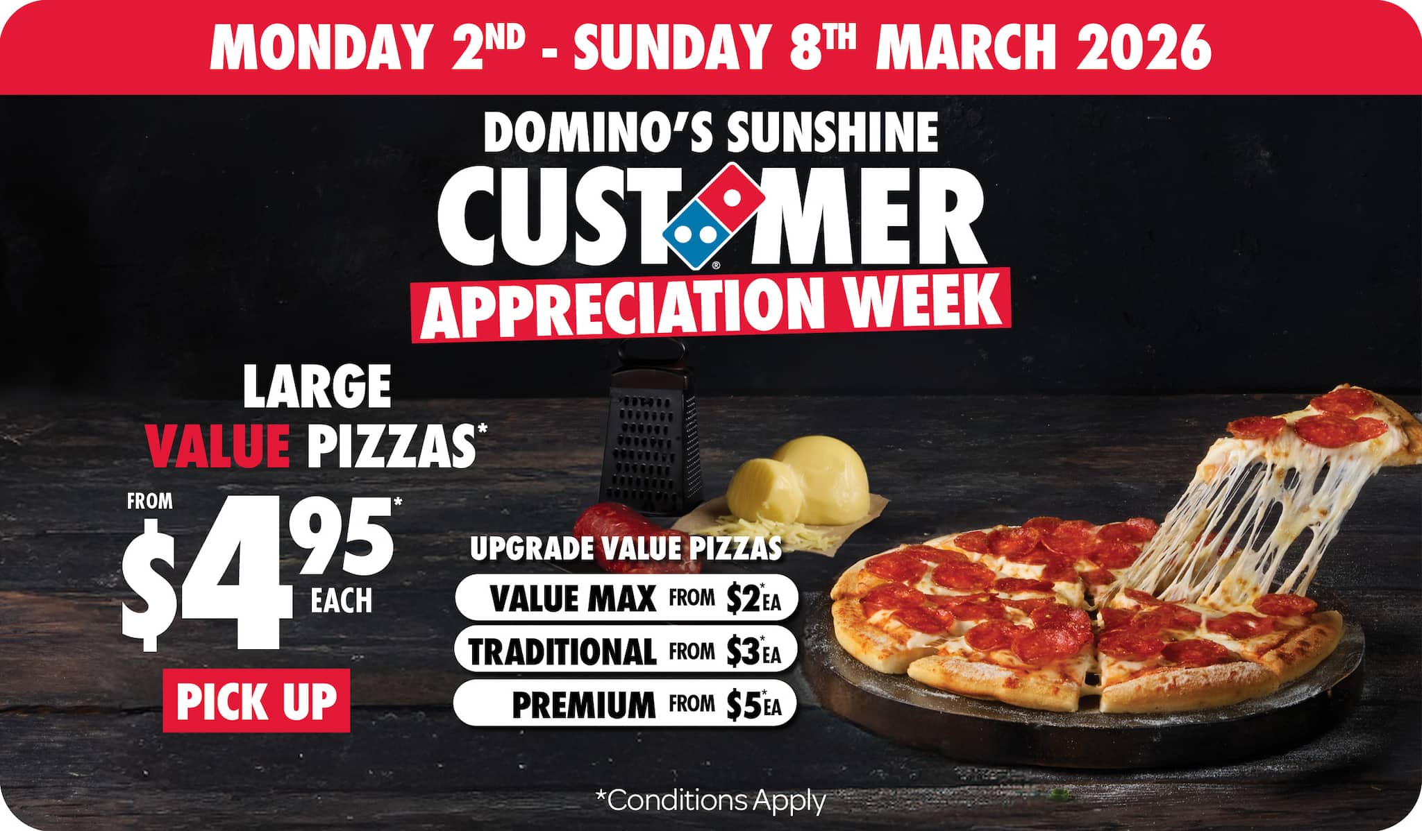 *10% surcharge applies on Sundays and after 10pm in selected stores. Surcharge of up to 20% applies on Public Holidays. Minimum delivery order $22.90 (excluding extended delivery, after 10pm, Sunday, and Public Holiday surcharges). Additional charges apply for extra toppings, half 'n' half & indulgent crusts. Limited area for delivery. For full terms and conditions click here.