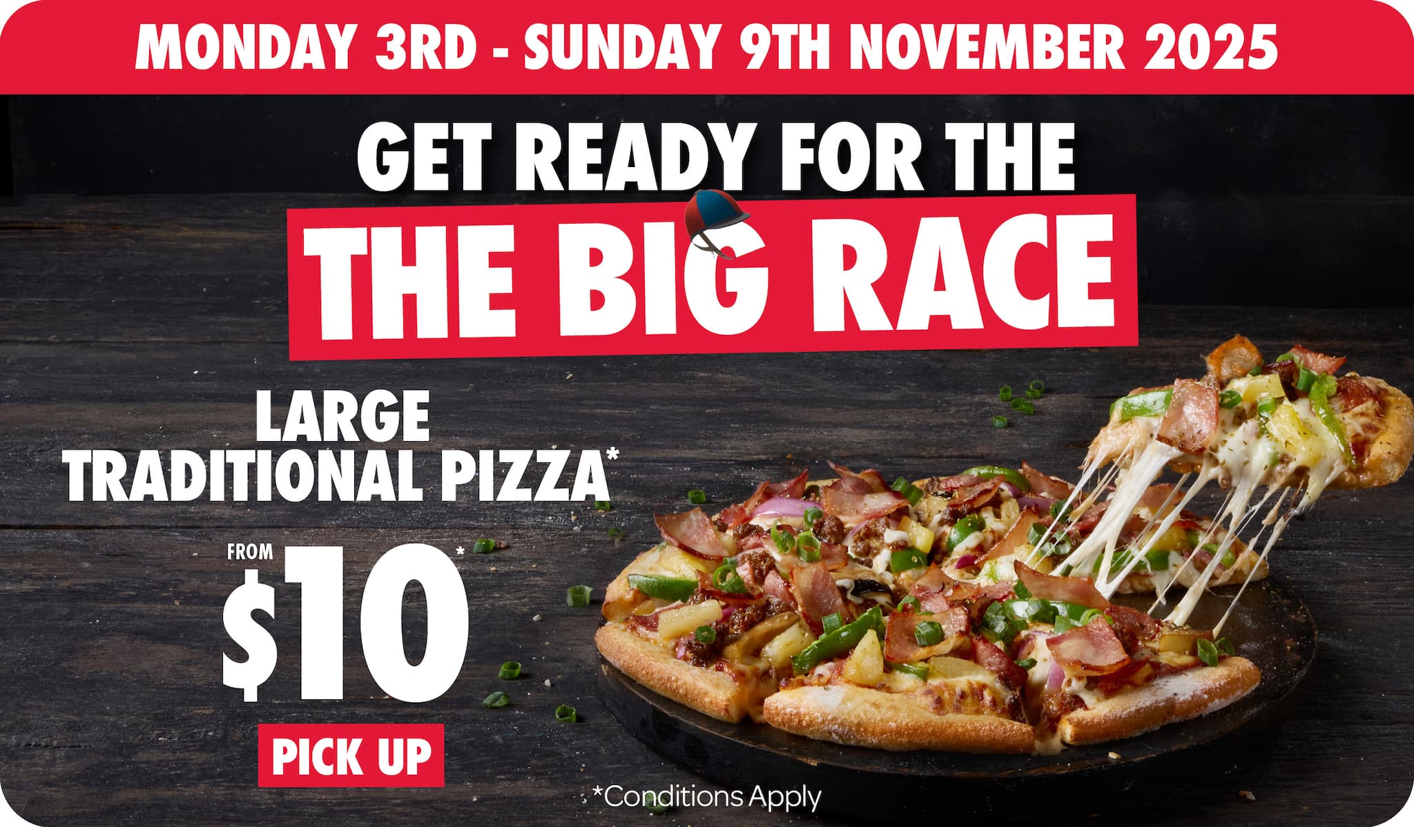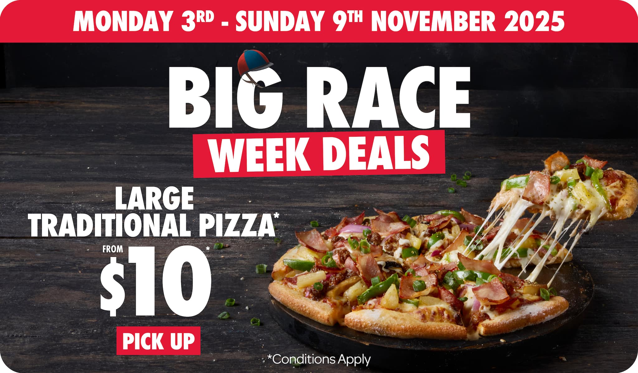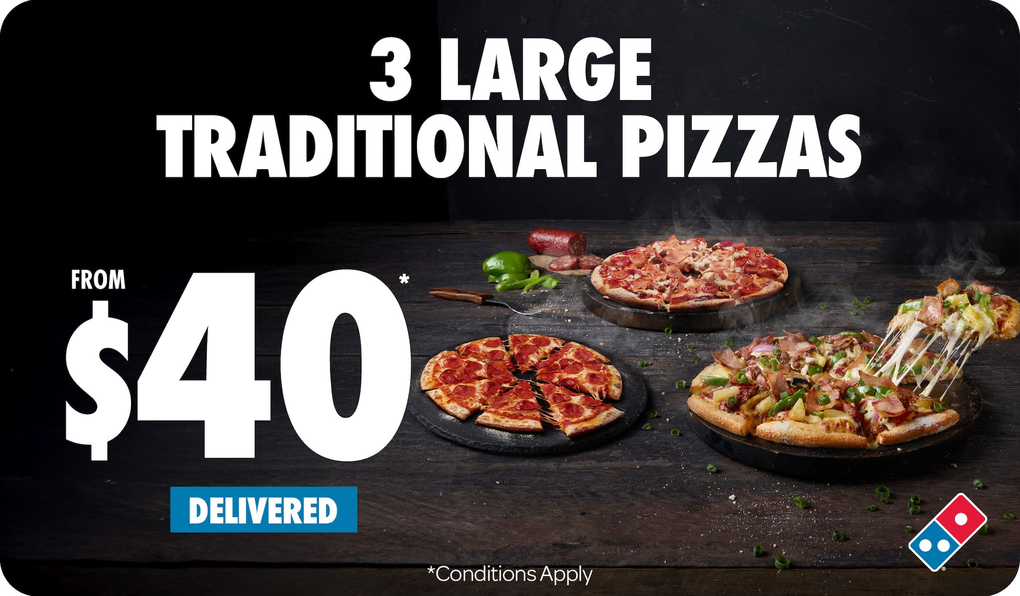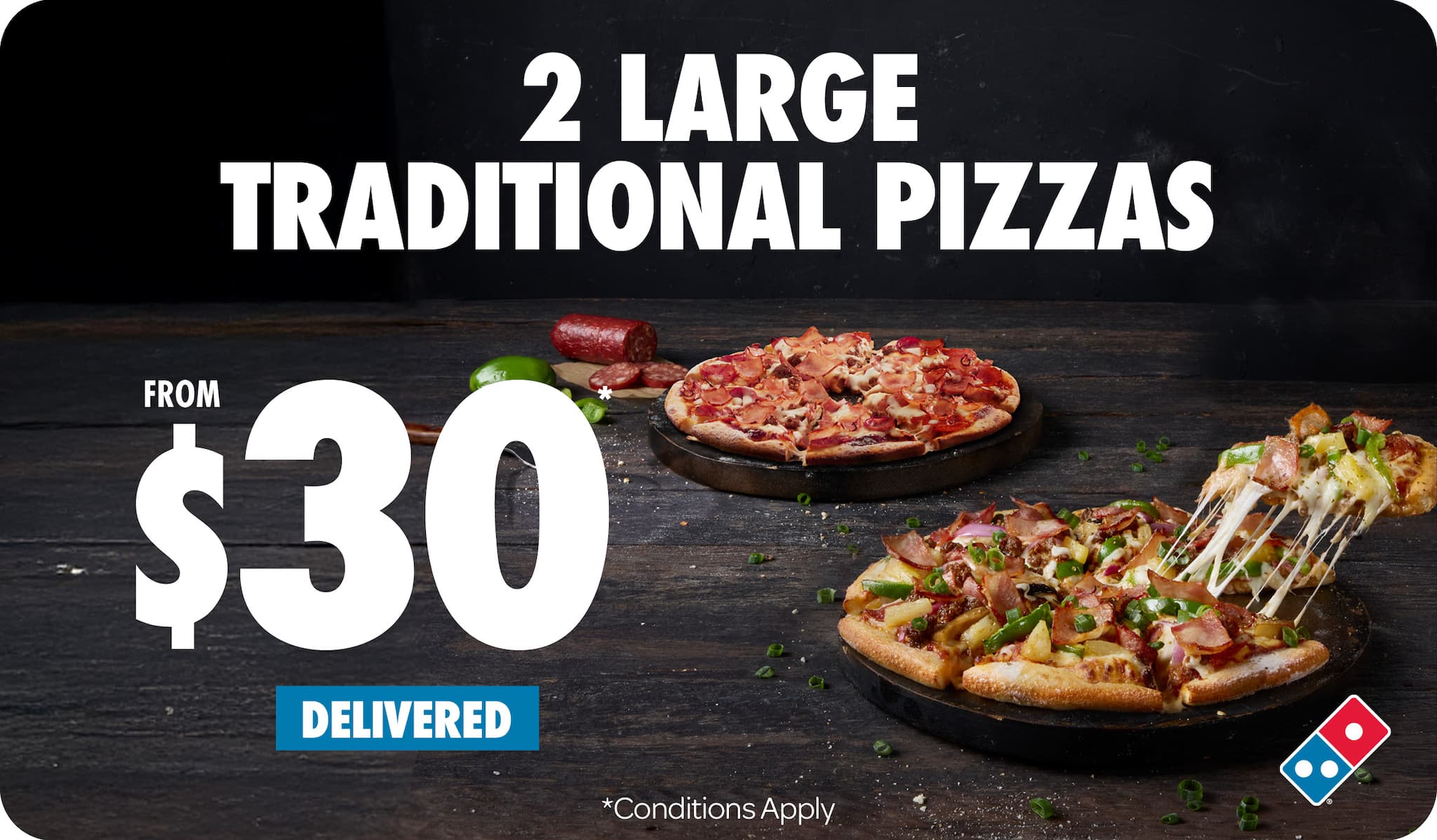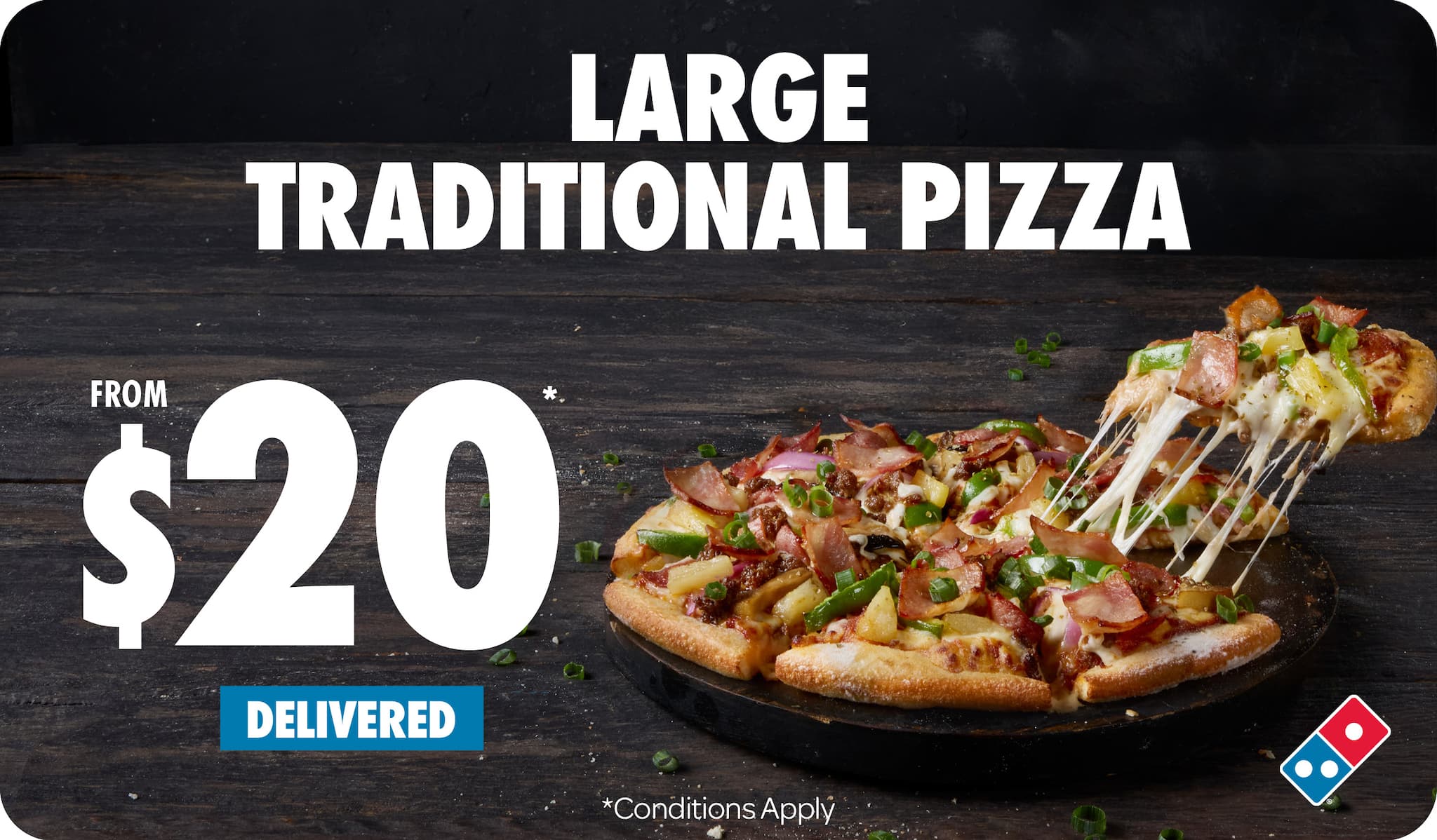 *10% surcharge applies on Sundays and after 10pm in selected stores. Surcharge of up to 20% applies on Public Holidays. Minimum delivery order $22.90 (excluding extended delivery, after 10pm, Sunday, and Public Holiday surcharges). Additional charges apply for extra toppings, half 'n' half & indulgent crusts. Limited area for delivery. For full terms and conditions click here.