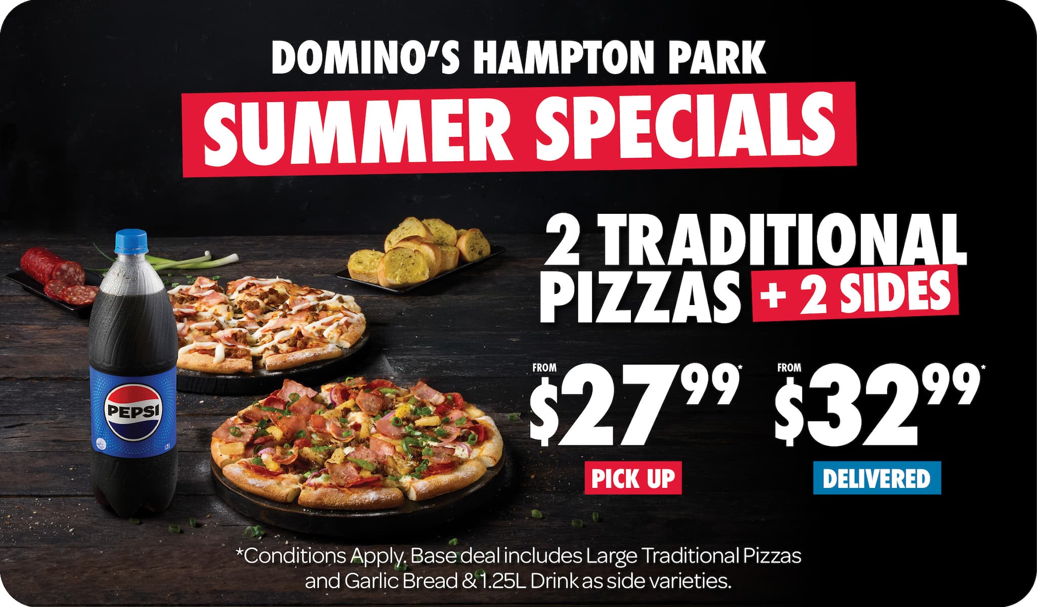 *10% surcharge applies on Sundays and after 10pm in selected stores. Surcharge of up to 20% applies on Public Holidays. Minimum delivery order $22.90 (excluding extended delivery, after 10pm, Sunday, and Public Holiday surcharges). Additional charges apply for extra toppings, half 'n' half & indulgent crusts. Limited area for delivery. For full terms and conditions click here.