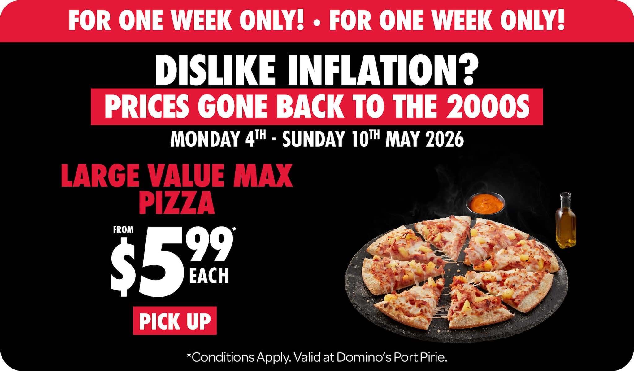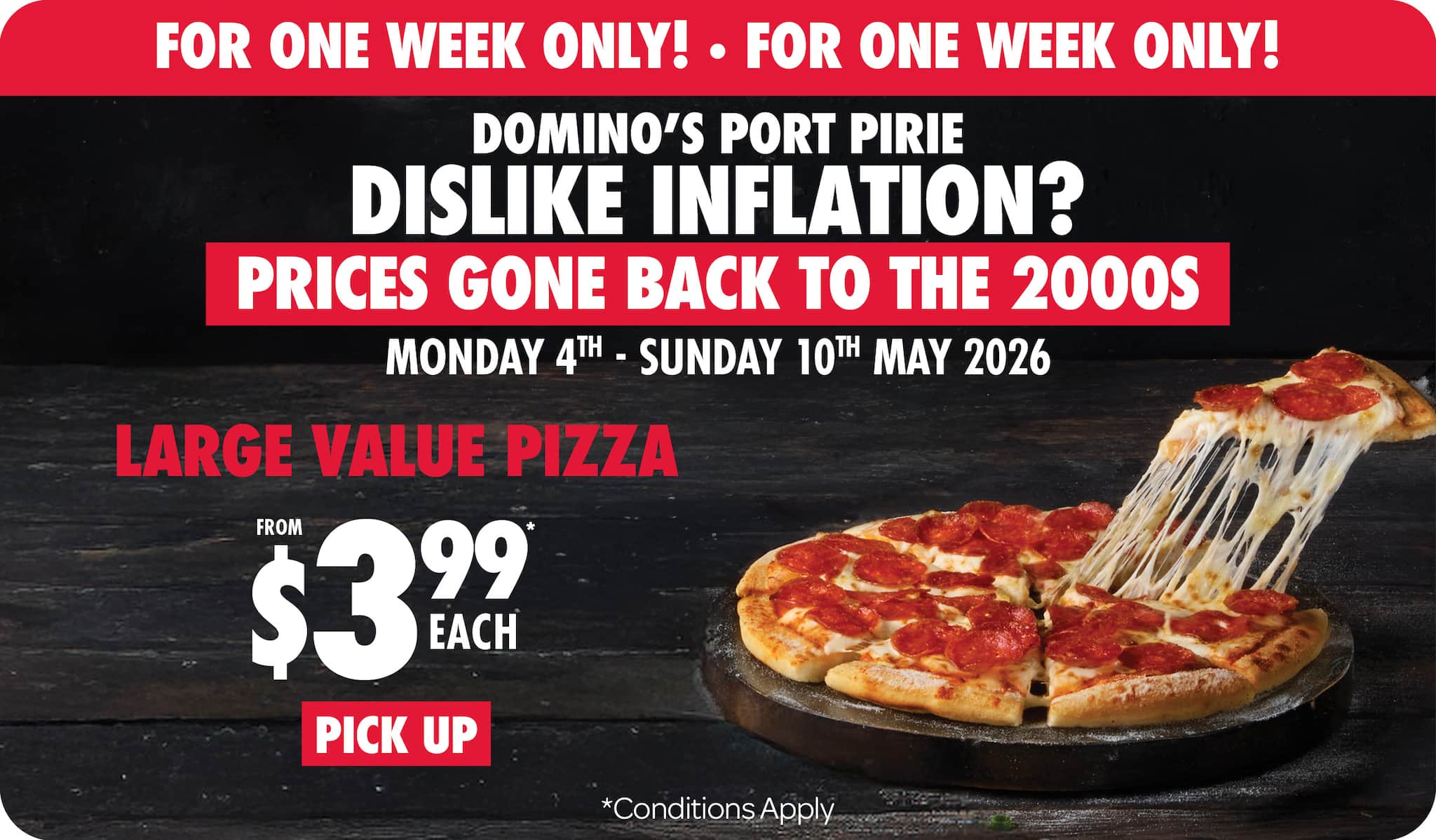 *10% surcharge applies on Sundays and after 10pm in selected stores. Surcharge of up to 20% applies on Public Holidays. Minimum delivery order $22.90 (excluding extended delivery, after 10pm, Sunday, and Public Holiday surcharges). Additional charges apply for extra toppings, half 'n' half & indulgent crusts. Limited area for delivery. For full terms and conditions click here.