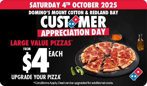 Domino’s stores will endeavour to provide products that do not contain allergens if requested by you, but traces of allergens, including traces of gluten, may be unintentionally present in food due to cross-contact during store operations. We cannot guarantee that your order will not contain allergens or gluten. Subject to law, Domino’s will not be liable for any costs, fees, claims, damages, or charges whatsoever, including medical costs, if a customer has any adverse reaction to a product sold through a Domino’s store. Please note that alterations to our menu and ingredients sourced from various suppliers may affect the allergen content of our menu items. We recommend customers read our Allergen & Nutritional Information listed for each product on our website or contact the Domino’s vocal team https://www.dominos.com.au/about-us/contact-us/feedback-form for further information.