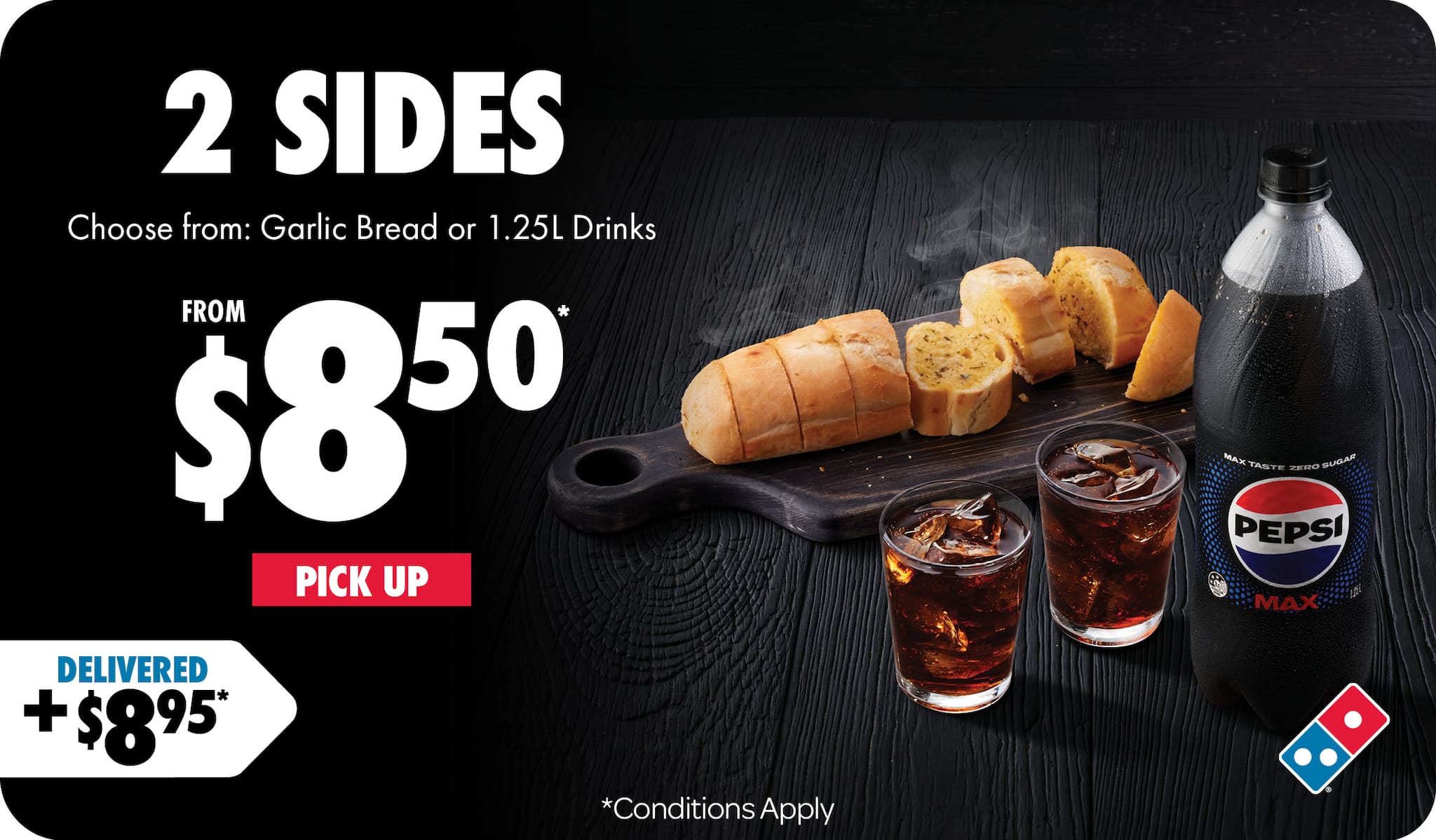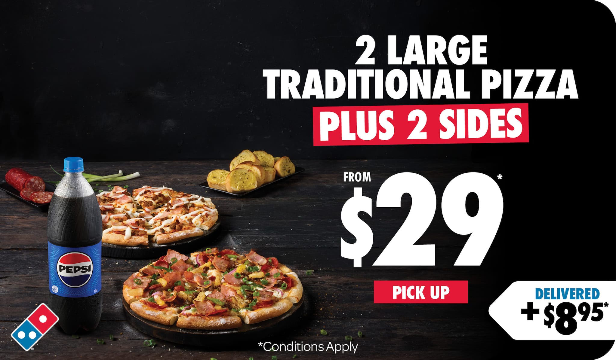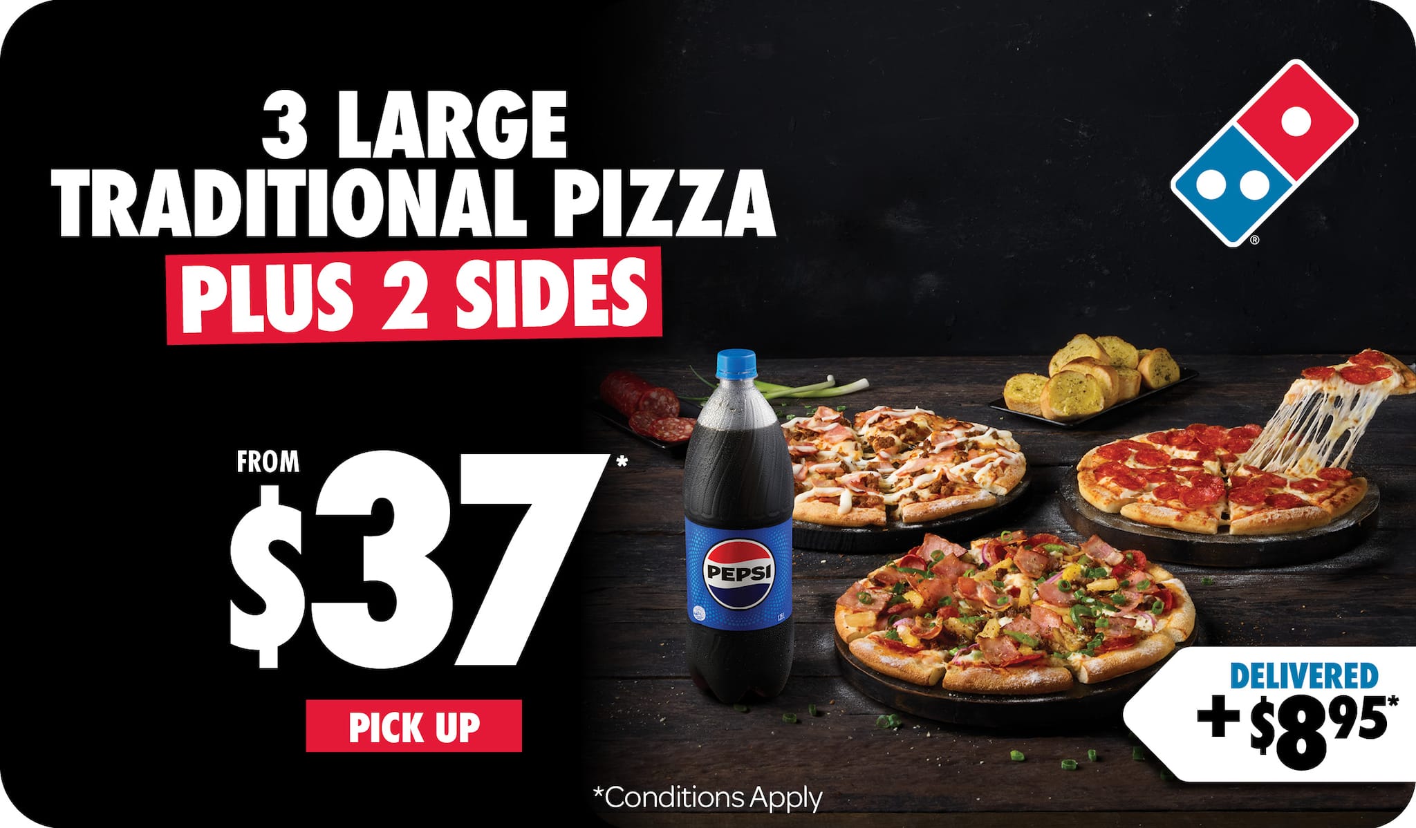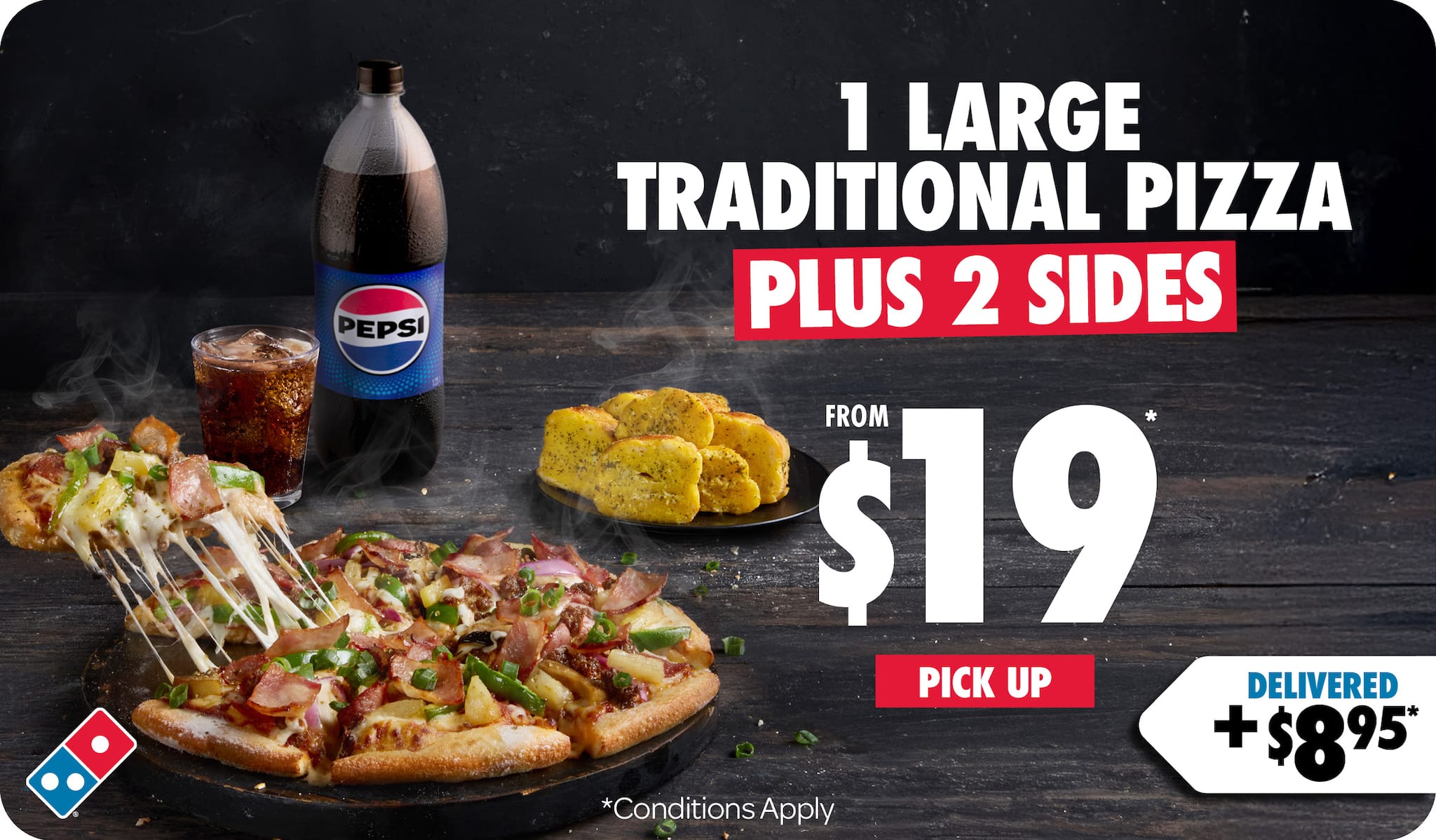 *Conditions apply. Valid until 09/11/2025. Price includes Large Traditional range pizza and Garlic Bread or 1.25L drink varieties as sides.
