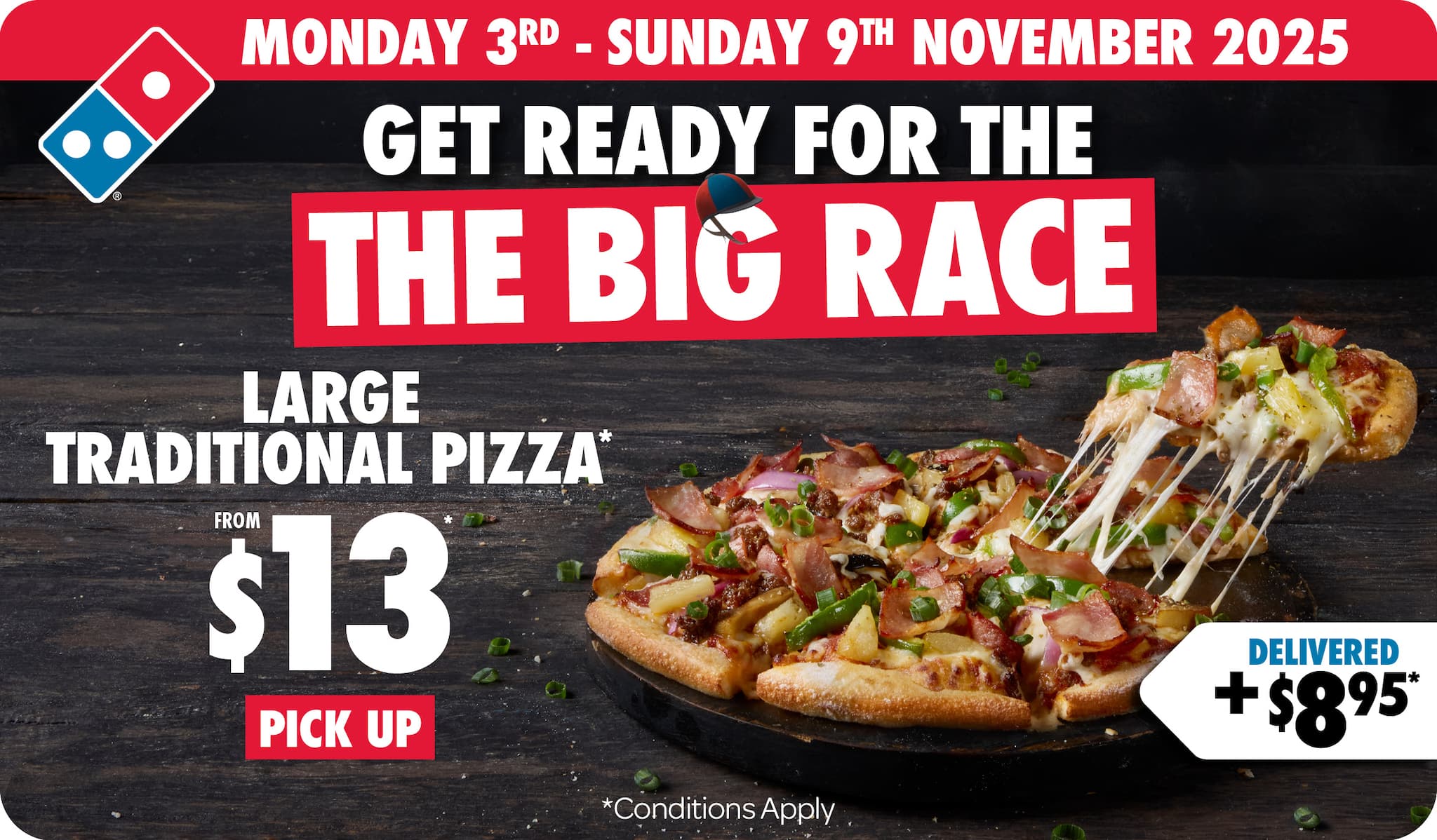 *10% surcharge applies on Sundays and after 10pm in selected stores. Surcharge of up to 20% applies on Public Holidays. Minimum delivery order $22.90 (excluding extended delivery, after 10pm, Sunday, and Public Holiday surcharges). Additional charges apply for extra toppings, half 'n' half & indulgent crusts. Limited area for delivery. For full terms and conditions click here.