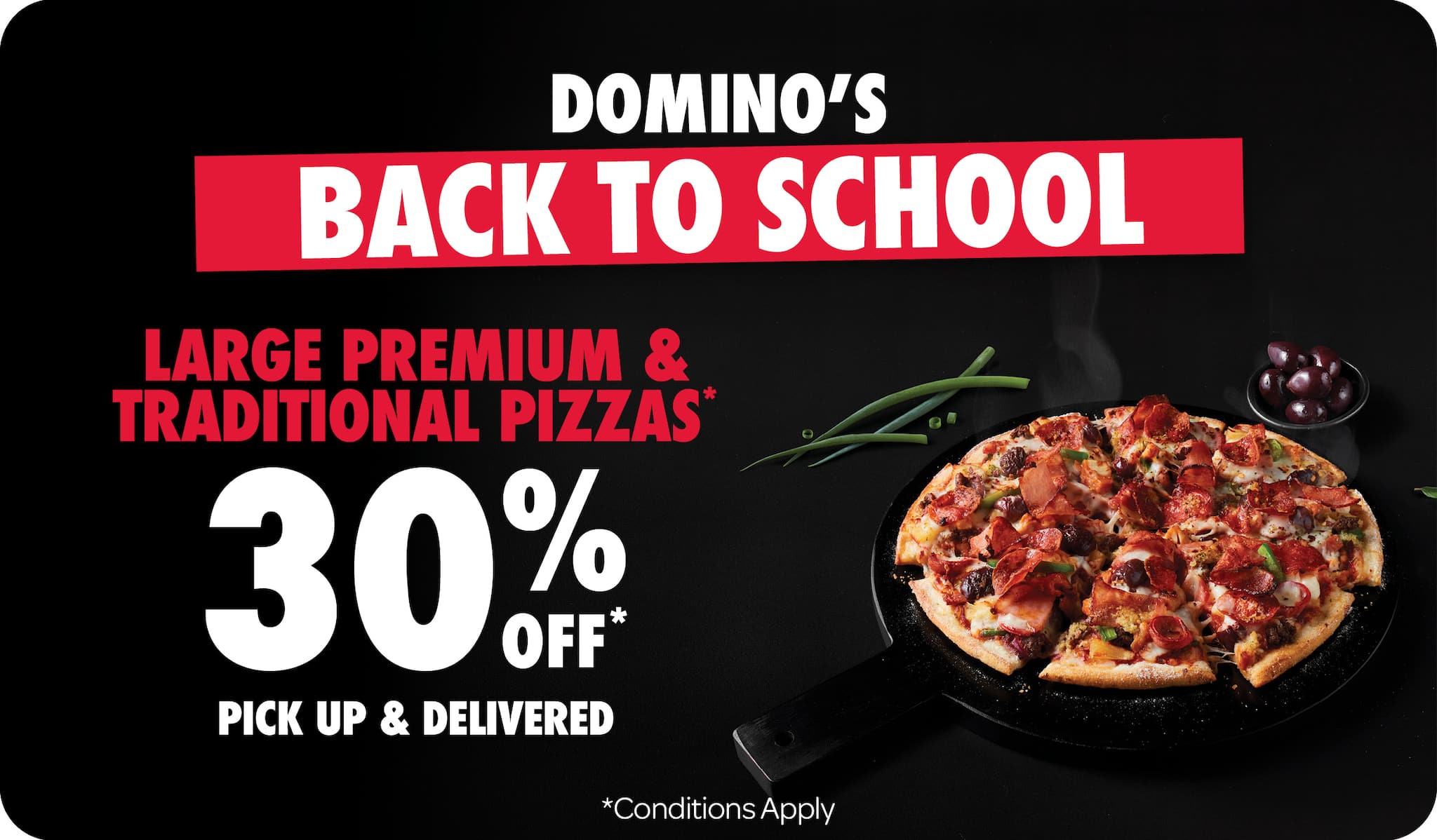 *10% surcharge applies on Sundays and after 10pm in selected stores. Surcharge of up to 20% applies on Public Holidays. Minimum delivery order $22.90 (excluding extended delivery, after 10pm, Sunday, and Public Holiday surcharges). Additional charges apply for extra toppings, half 'n' half & indulgent crusts. Limited area for delivery. For full terms and conditions click here.