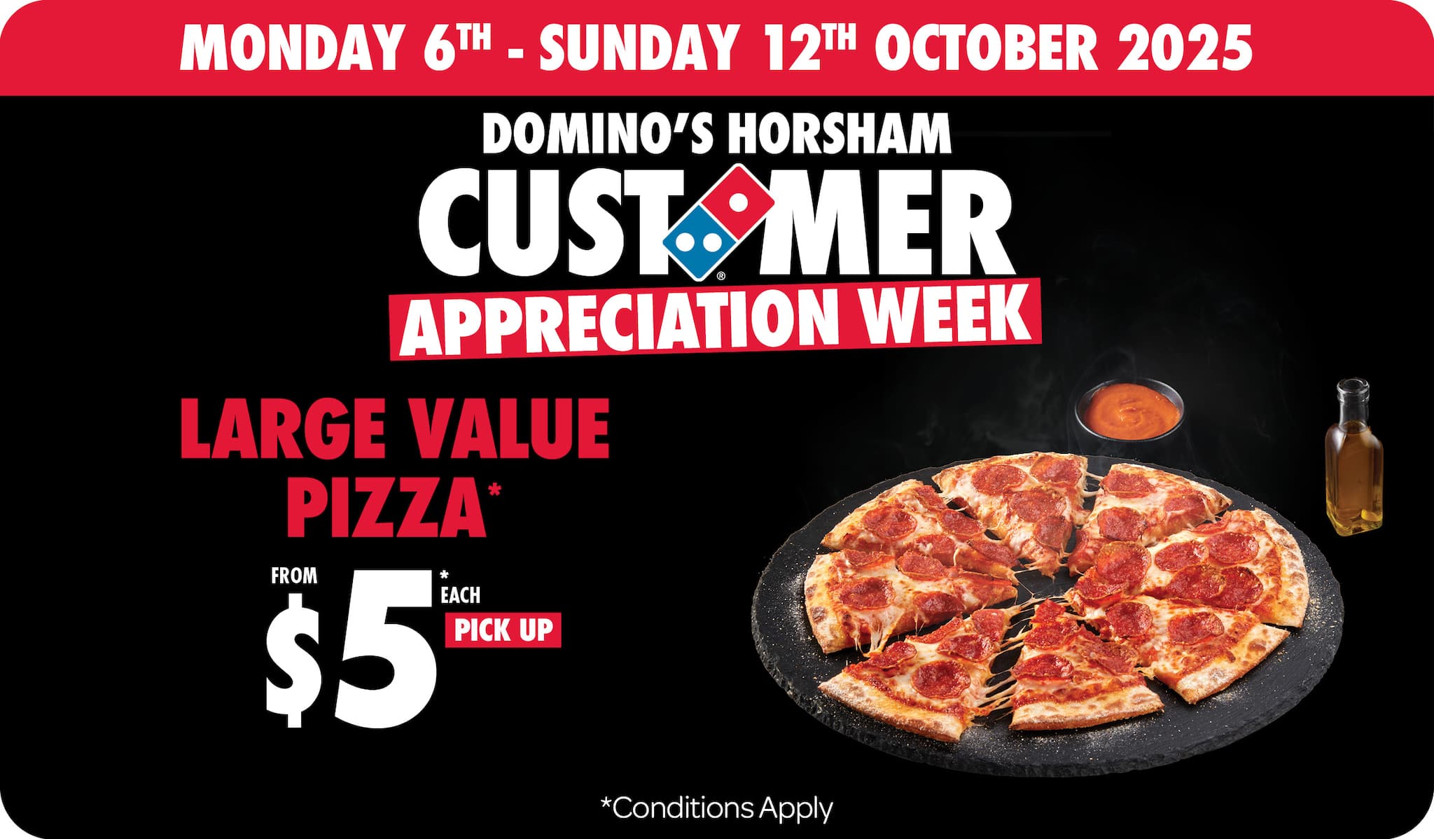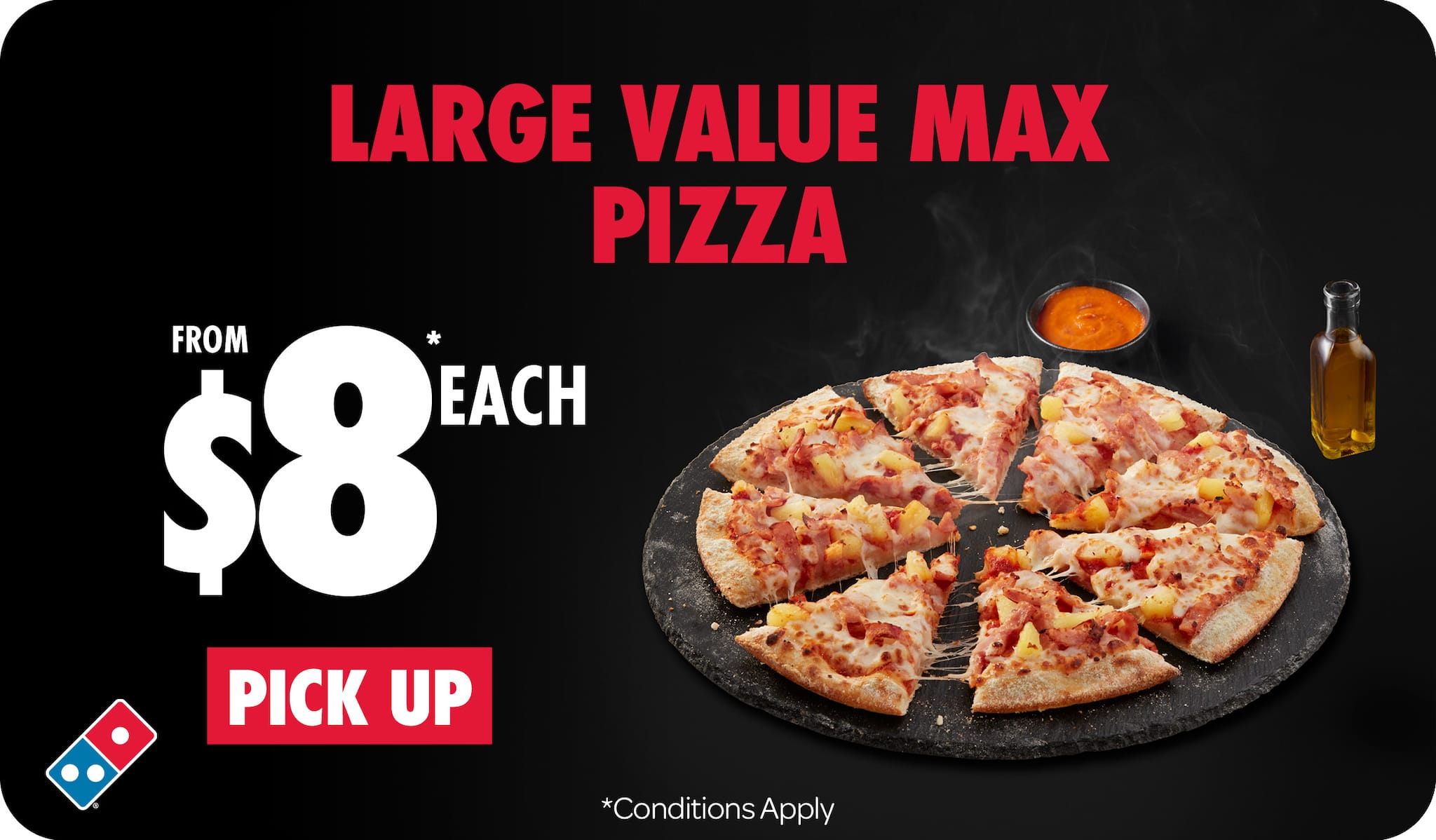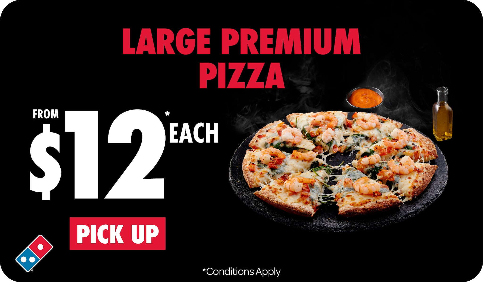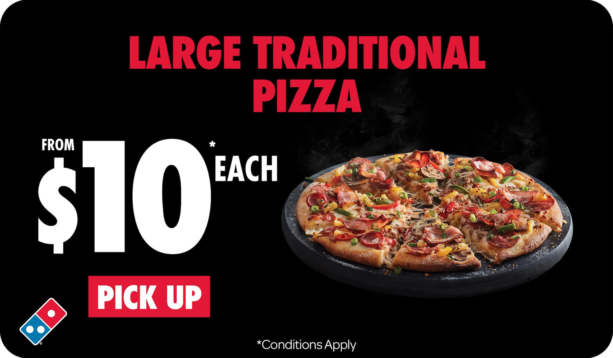 *The displayed prices are local prices at your selected store only. Customisation may incur additional charges. A $2 Half ’n’ Half surcharge applies to Large Pizzas; not available for Vegan Cheese, Gluten Free, or Lunch Box pizzas. Extra charges on Large Pizzas: $3 for Vegan Cheese, , $3.60 for Gluten Free Sourdough Crust, $3.50 for Cheesy Crust, $4 for Garlic Cheesy Crust; Premium Pizzas are $3 more than Traditional when using a Traditional Pizza voucher. Upgrade a Large to Family Size for $4 extra. Family available on Classic Crusts only. Family pizzas are 50% bigger in surface size post-bake, and have 50% more toppings, than Large Pizzas. Cheesy Crust, Garlic Cheesy Crust and Gluten Free Sourdough Crust available on Large Pizzas only. No indulgent crusts allowed on Vegan Cheese Pizzas. Substitute toppings may not be allowed on Promotional Pizzas. Mini Pizzas in Lunch Box are not customisable, vegan pizzas are not available.