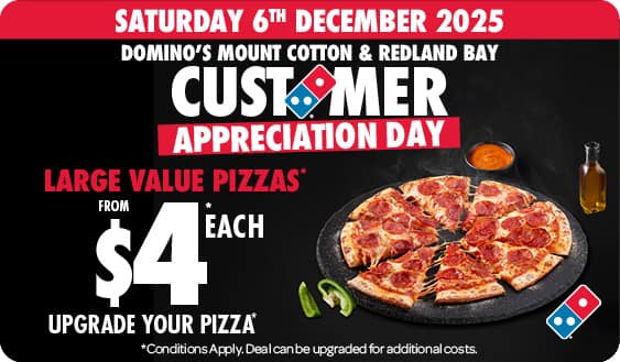 *10% surcharge applies on Sundays and after 10pm in selected stores. Surcharge of up to 20% applies on Public Holidays. Minimum delivery order $22.90 (excluding extended delivery, after 10pm, Sunday, and Public Holiday surcharges). Additional charges apply for extra toppings, half 'n' half & indulgent crusts. Limited area for delivery. For full terms and conditions click here.