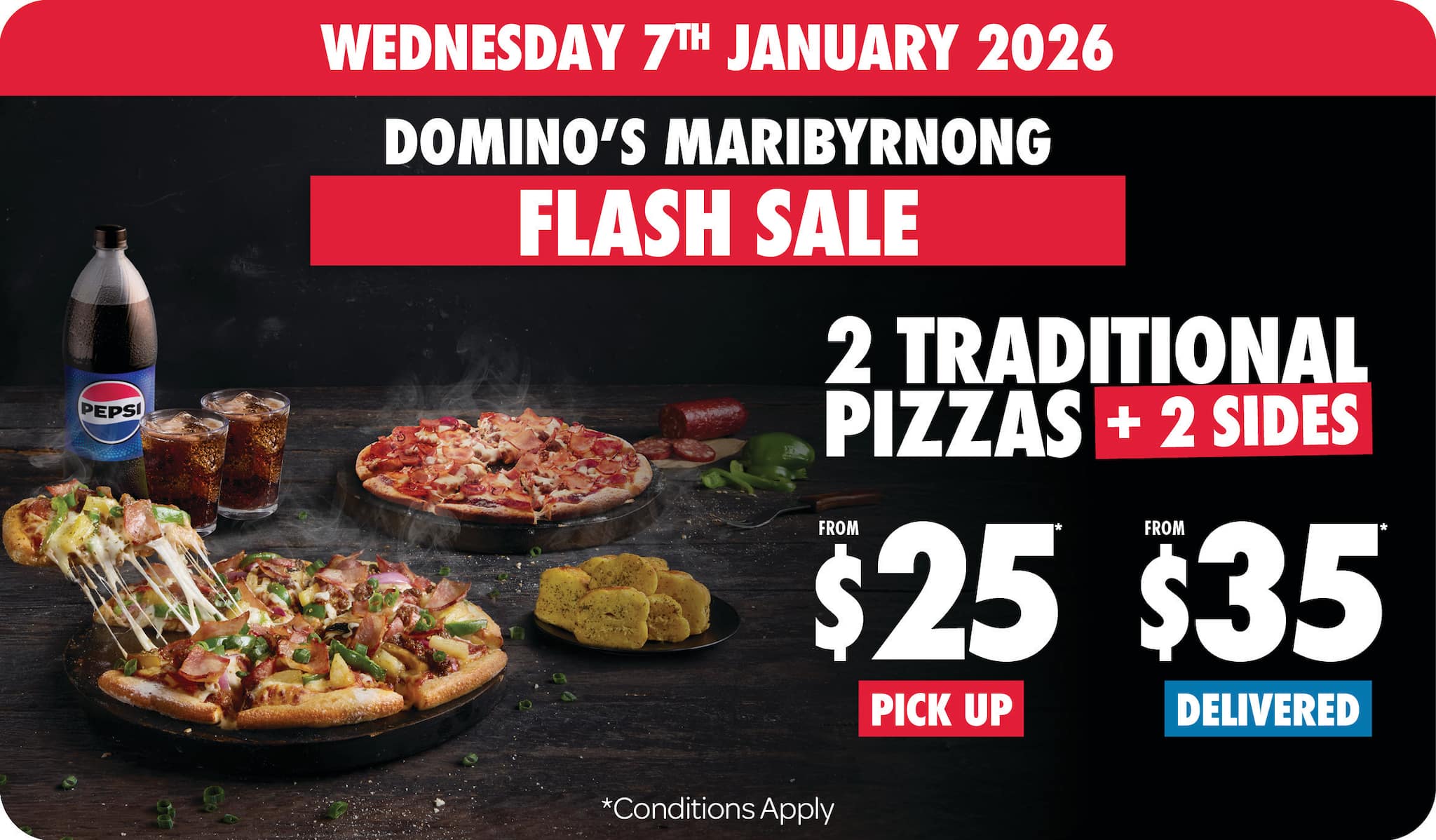 ORDER delivery NOW*Conditions apply. Valid on 07/01/20265 only. Deal includes Large Traditional Pizzas, Garlic Bread & 1.25L Drinks varieties.