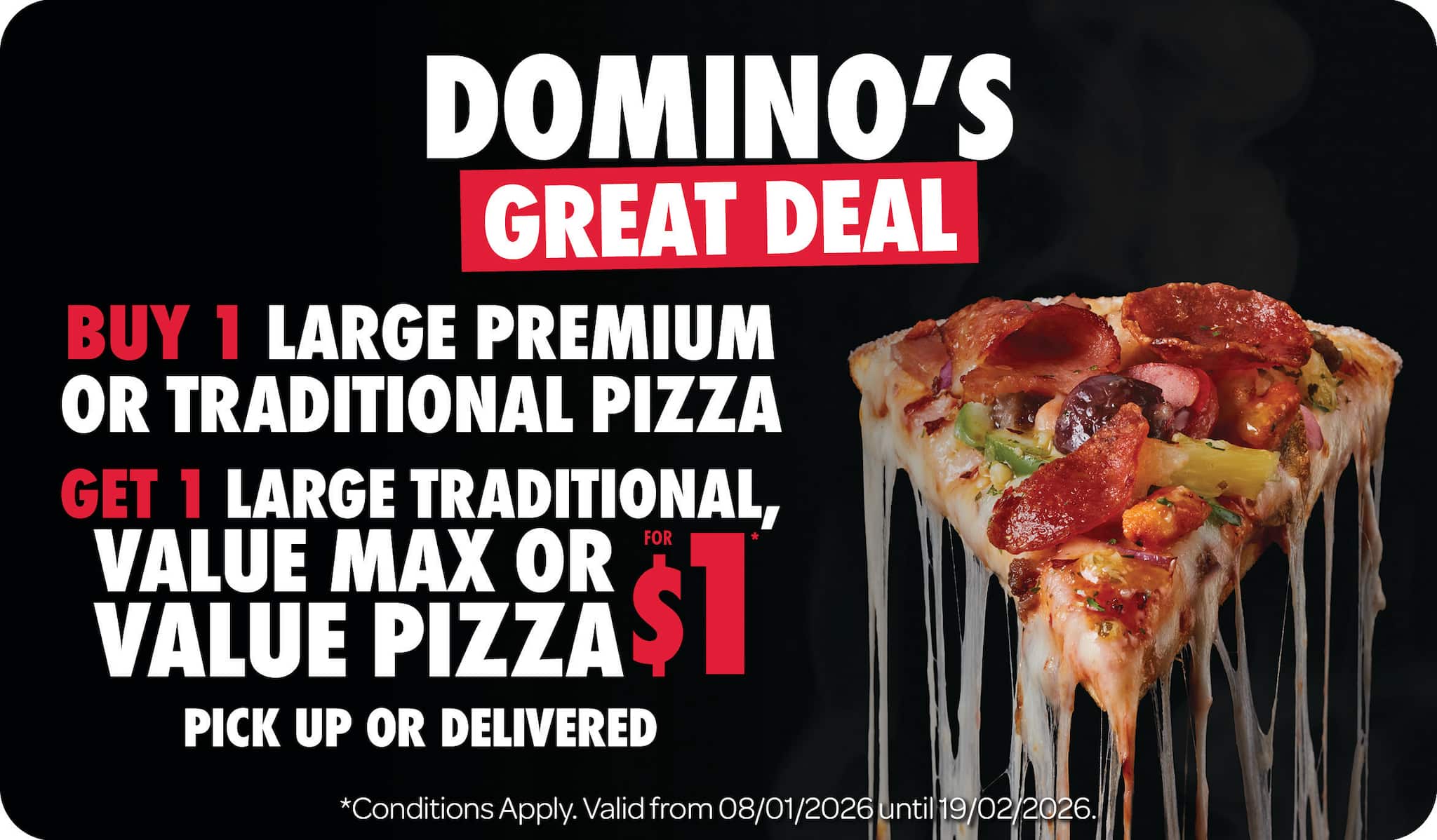*10% surcharge applies on Sundays and after 10pm in selected stores. Surcharge of up to 20% applies on Public Holidays. Minimum delivery order $22.90 (excluding extended delivery, after 10pm, Sunday, and Public Holiday surcharges). Additional charges apply for extra toppings, half 'n' half & indulgent crusts. Limited area for delivery. For full terms and conditions click here.