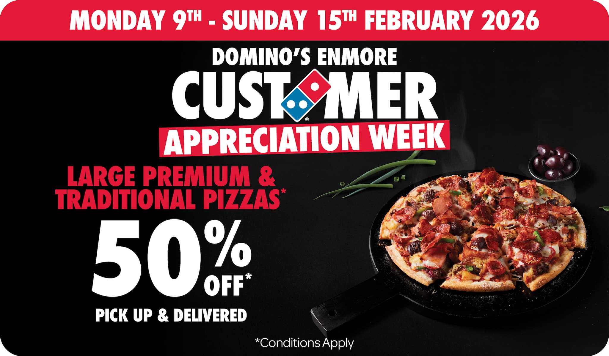 *10% surcharge applies on Sundays and after 10pm in selected stores. Surcharge of up to 20% applies on Public Holidays. Minimum delivery order $22.90 (excluding extended delivery, after 10pm, Sunday, and Public Holiday surcharges). Additional charges apply for extra toppings, half 'n' half & indulgent crusts. Limited area for delivery. For full terms and conditions click here.