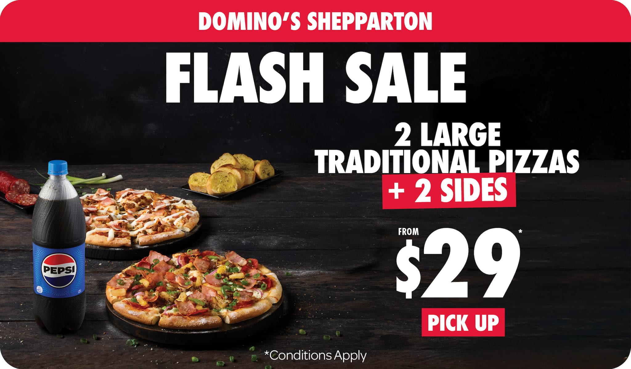 *The displayed prices are local prices at your selected store only. Customisation may incur additional charges. A $2 Half ’n’ Half surcharge applies to Large Pizzas; not available for Vegan Cheese, Gluten Free, or Lunch Box pizzas. Extra charges on Large Pizzas: $3 for Vegan Cheese, , $3.60 for Gluten Free Sourdough Crust, $3.50 for Cheesy Crust, $4 for Garlic Cheesy Crust; Premium Pizzas are $3 more than Traditional when using a Traditional Pizza voucher. Upgrade a Large to Family Size for $4 extra. Family available on Classic Crusts only. Family pizzas are 50% bigger in surface size post-bake, and have 50% more toppings, than Large Pizzas. Cheesy Crust,  Garlic Cheesy Crust and Gluten Free Sourdough Crust available on Large Pizzas only. No indulgent crusts allowed on Vegan Cheese Pizzas. Substitute toppings may not be allowed on Promotional Pizzas. Mini Pizzas in Lunch Box are not customisable, vegan pizzas are not available.