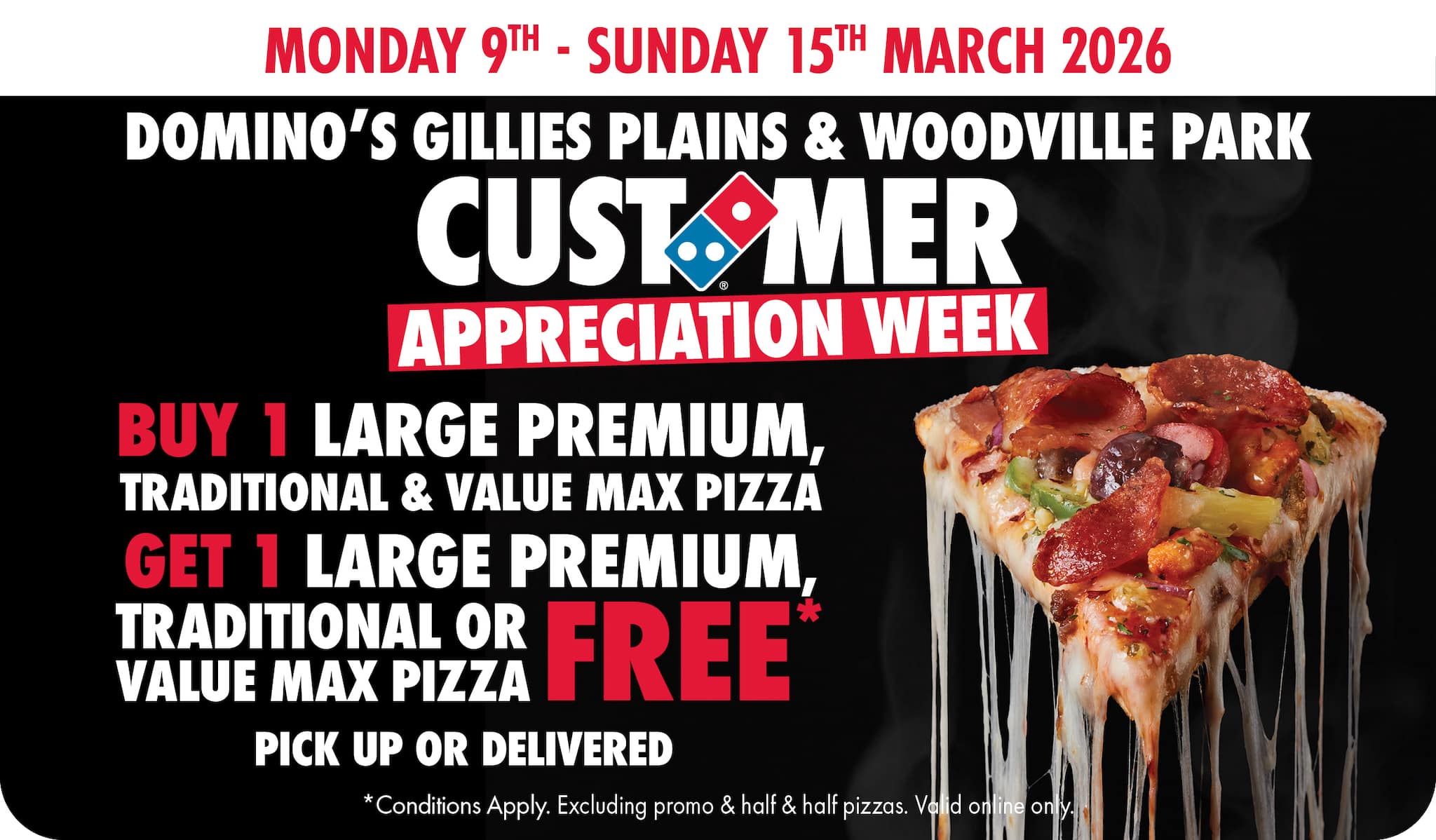ORDER NOW*Conditions apply. Valid until 15/03/2026. Online only. Buy 1 full‑priced Large Premium, Traditional or Value Max pizza and get 1 Large pizza FREE* of equal or lesser value.