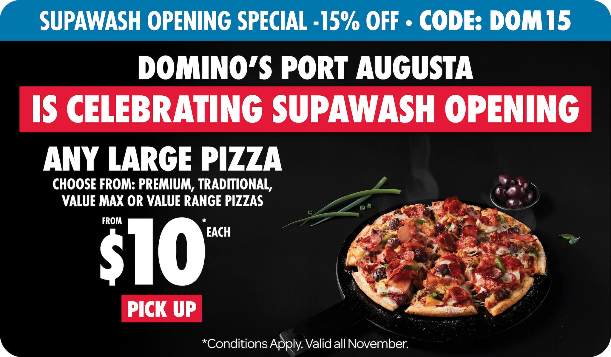 *10% surcharge applies on Sundays and after 10pm in selected stores. Surcharge of up to 20% applies on Public Holidays. Minimum delivery order $22.90 (excluding extended delivery, after 10pm, Sunday, and Public Holiday surcharges). Additional charges apply for extra toppings, half 'n' half & indulgent crusts. Limited area for delivery. For full terms and conditions click here.