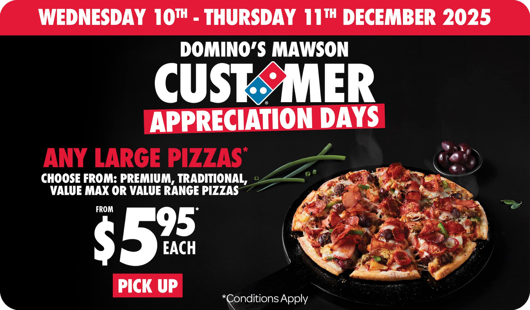 *10% surcharge applies on Sundays and after 10pm in selected stores. Surcharge of up to 20% applies on Public Holidays. Minimum delivery order $22.90 (excluding extended delivery, after 10pm, Sunday, and Public Holiday surcharges). Additional charges apply for extra toppings, half 'n' half & indulgent crusts. Limited area for delivery. For full terms and conditions click here.