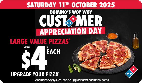 *The displayed prices are local prices at your selected store only. Customisation may incur additional charges. A $2 Half ’n’ Half surcharge applies to Large Pizzas; not available for Vegan Cheese, Gluten Free, or Lunch Box pizzas. Extra charges on Large Pizzas: $3 for Vegan Cheese, , $3.60 for Gluten Free Sourdough Crust, $3.50 for Cheesy Crust, $4 for Garlic Cheesy Crust; Premium Pizzas are $3 more than Traditional when using a Traditional Pizza voucher. Upgrade a Large to Family Size for $4 extra. Family available on Classic Crusts only. Family pizzas are 50% bigger in surface size post-bake, and have 50% more toppings, than Large Pizzas. Cheesy Crust,  Garlic Cheesy Crust and Gluten Free Sourdough Crust available on Large Pizzas only. No indulgent crusts allowed on Vegan Cheese Pizzas. Substitute toppings may not be allowed on Promotional Pizzas. Mini Pizzas in Lunch Box are not customisable, vegan pizzas are not available.