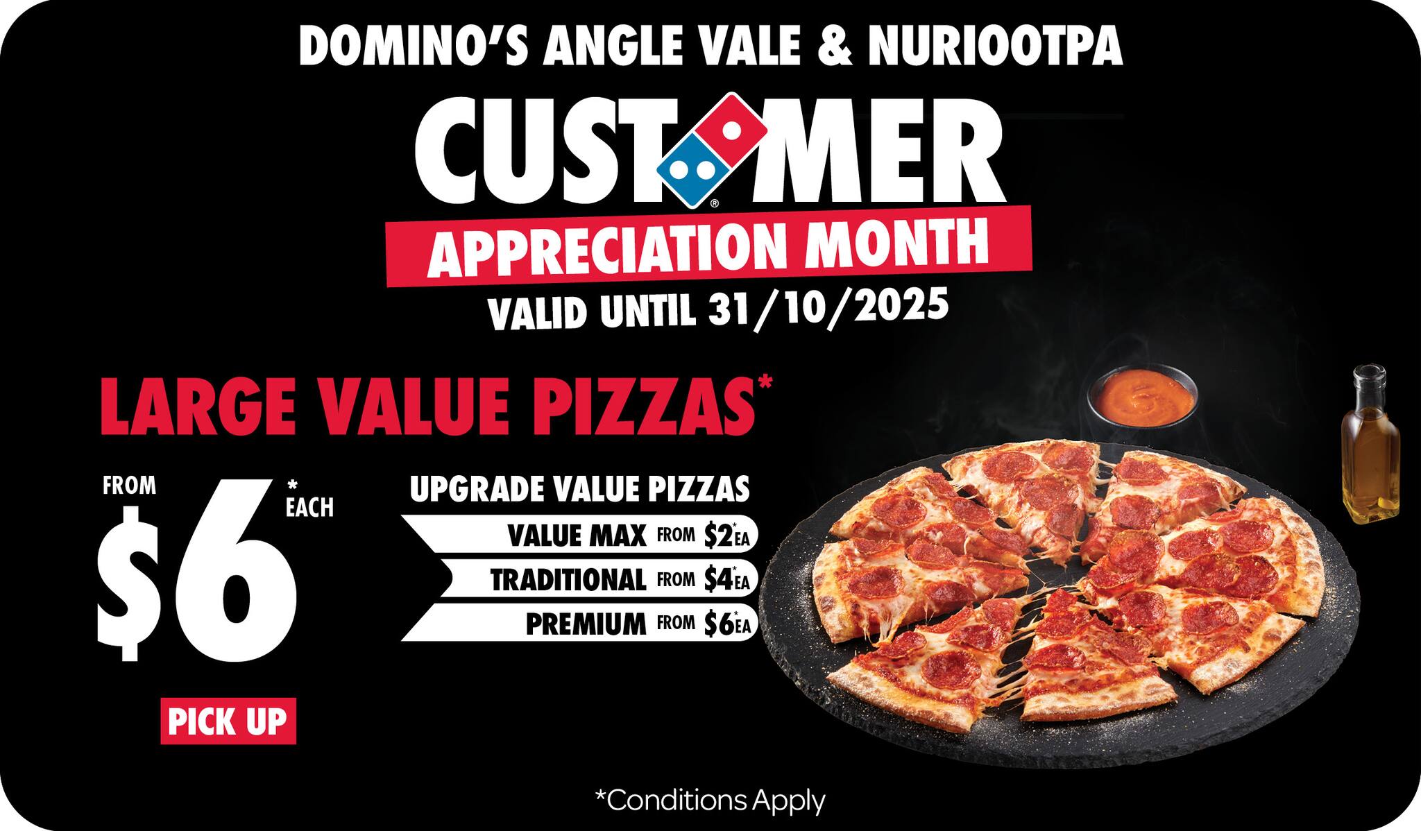 *The displayed prices are local prices at your selected store only. Customisation may incur additional charges. A $2 Half ’n’ Half surcharge applies to Large Pizzas; not available for Vegan Cheese, Gluten Free, or Lunch Box pizzas. Extra charges on Large Pizzas: $3 for Vegan Cheese, , $3.60 for Gluten Free Sourdough Crust, $3.50 for Cheesy Crust, $4 for Garlic Cheesy Crust; Premium Pizzas are $3 more than Traditional when using a Traditional Pizza voucher. Upgrade a Large to Family Size for $4 extra. Family available on Classic Crusts only. Family pizzas are 50% bigger in surface size post-bake, and have 50% more toppings, than Large Pizzas. Cheesy Crust,  Garlic Cheesy Crust and Gluten Free Sourdough Crust available on Large Pizzas only. No indulgent crusts allowed on Vegan Cheese Pizzas. Substitute toppings may not be allowed on Promotional Pizzas. Mini Pizzas in Lunch Box are not customisable, vegan pizzas are not available.