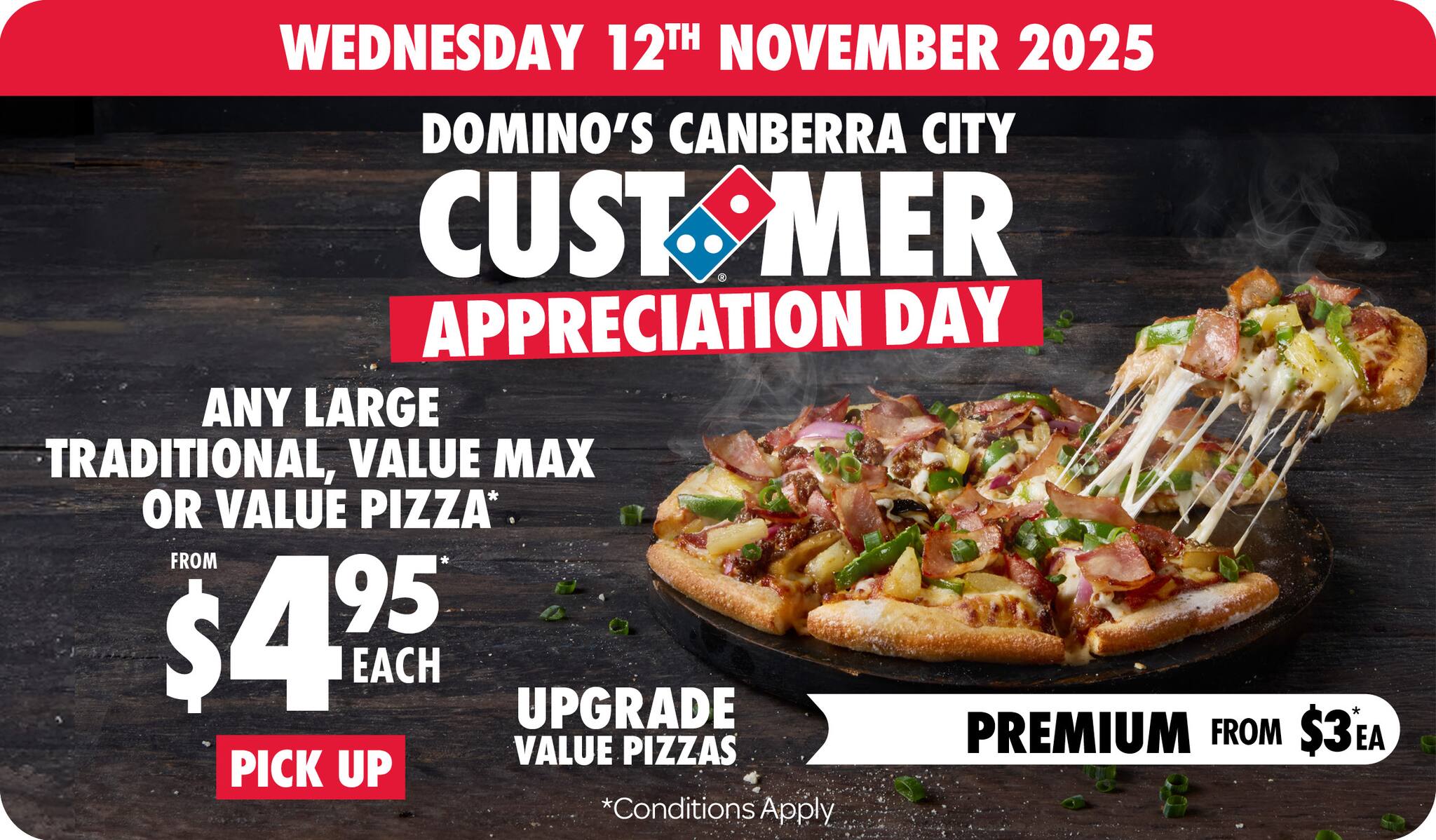 *10% surcharge applies on Sundays and after 10pm in selected stores. Surcharge of up to 20% applies on Public Holidays. Minimum delivery order $22.90 (excluding extended delivery, after 10pm, Sunday, and Public Holiday surcharges). Additional charges apply for extra toppings, half 'n' half & indulgent crusts. Limited area for delivery. For full terms and conditions click here.