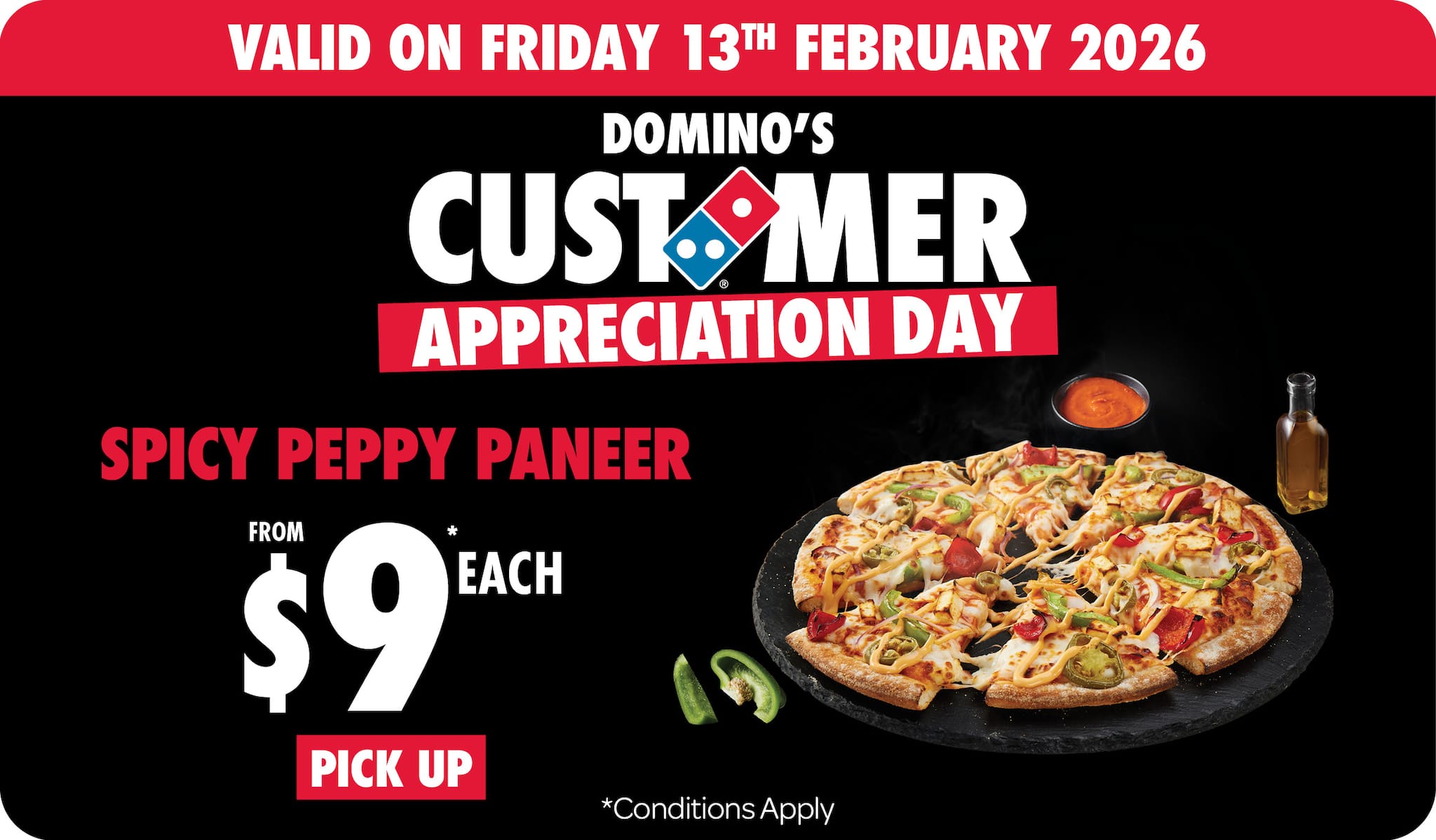 *10% surcharge applies on Sundays and after 10pm in selected stores. Surcharge of up to 20% applies on Public Holidays. Minimum delivery order $22.90 (excluding extended delivery, after 10pm, Sunday, and Public Holiday surcharges). Additional charges apply for extra toppings, half 'n' half & indulgent crusts. Limited area for delivery. For full terms and conditions click here.
