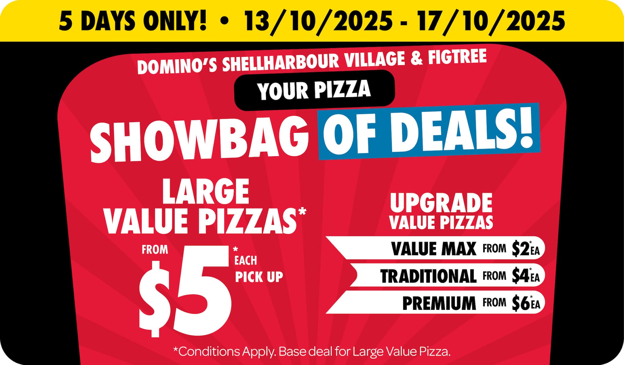 *The displayed prices are local prices at your selected store only. Customisation may incur additional charges. A $2 Half ’n’ Half surcharge applies to Large Pizzas; not available for Vegan Cheese, Gluten Free, or Lunch Box pizzas. Extra charges on Large Pizzas: $3 for Vegan Cheese, , $3.60 for Gluten Free Sourdough Crust, $3.50 for Cheesy Crust, $4 for Garlic Cheesy Crust; Premium Pizzas are $3 more than Traditional when using a Traditional Pizza voucher. Upgrade a Large to Family Size for $4 extra. Family available on Classic Crusts only. Family pizzas are 50% bigger in surface size post-bake, and have 50% more toppings, than Large Pizzas. Cheesy Crust, Garlic Cheesy Crust and Gluten Free Sourdough Crust available on Large Pizzas only. No indulgent crusts allowed on Vegan Cheese Pizzas. Substitute toppings may not be allowed on Promotional Pizzas. Mini Pizzas in Lunch Box are not customisable, vegan pizzas are not available.