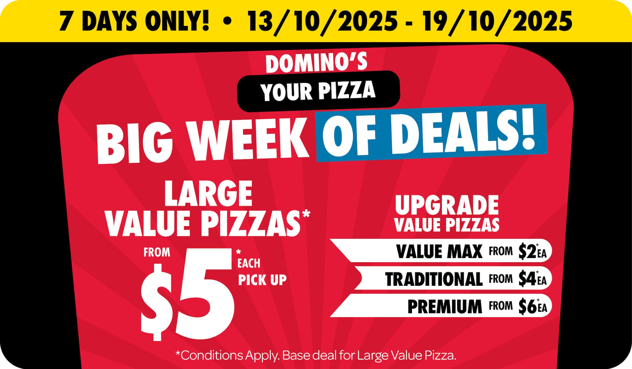 *10% surcharge applies on Sundays and after 10pm in selected stores. Surcharge of up to 20% applies on Public Holidays. Minimum delivery order $22.90 (excluding extended delivery, after 10pm, Sunday, and Public Holiday surcharges). Additional charges apply for extra toppings, half 'n' half & indulgent crusts. Limited area for delivery. For full terms and conditions click here.
