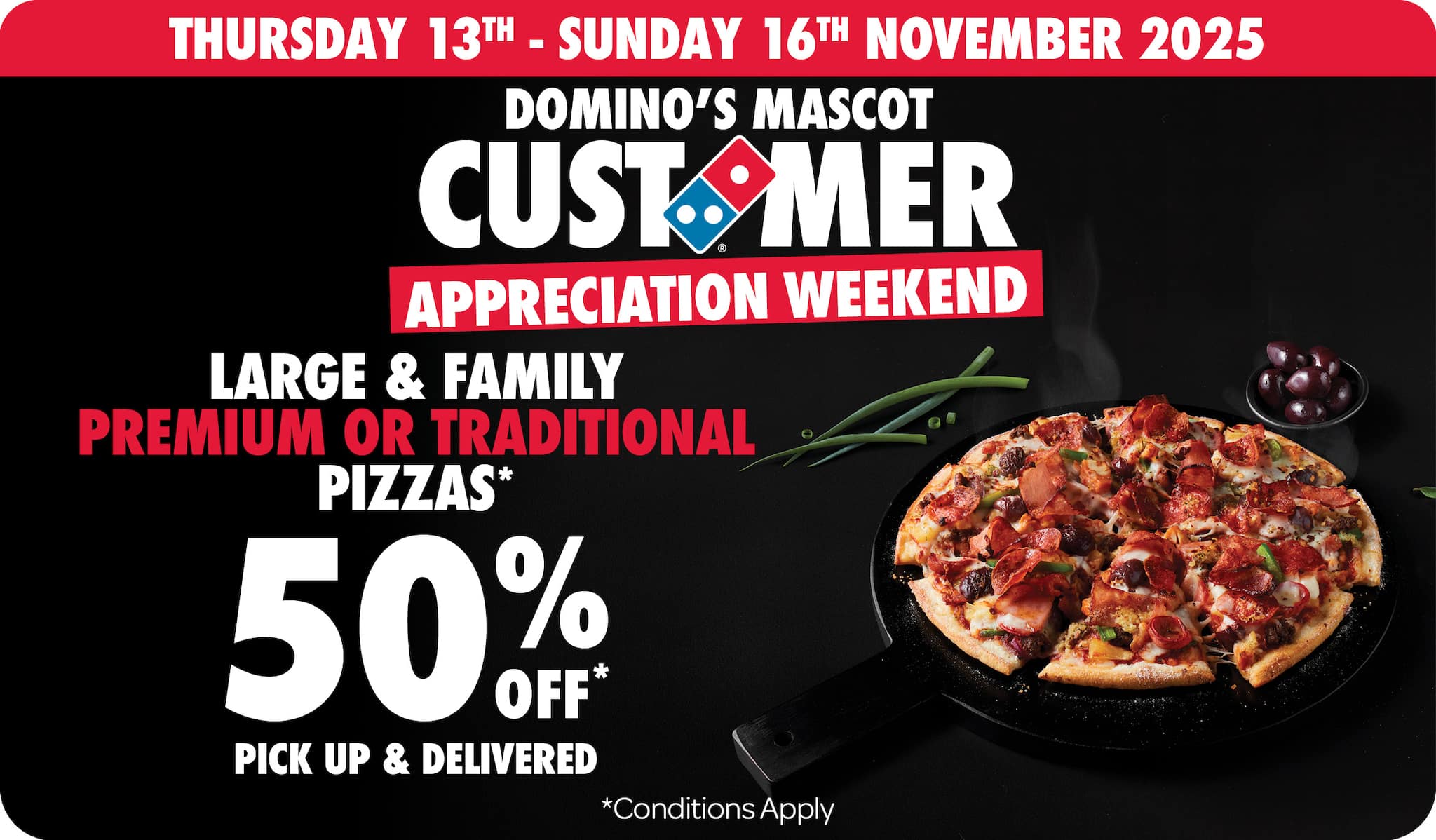 *10% surcharge applies on Sundays and after 10pm in selected stores. Surcharge of up to 20% applies on Public Holidays. Minimum delivery order $22.90 (excluding extended delivery, after 10pm, Sunday, and Public Holiday surcharges). Additional charges apply for extra toppings, half 'n' half & indulgent crusts. Limited area for delivery. For full terms and conditions click here.