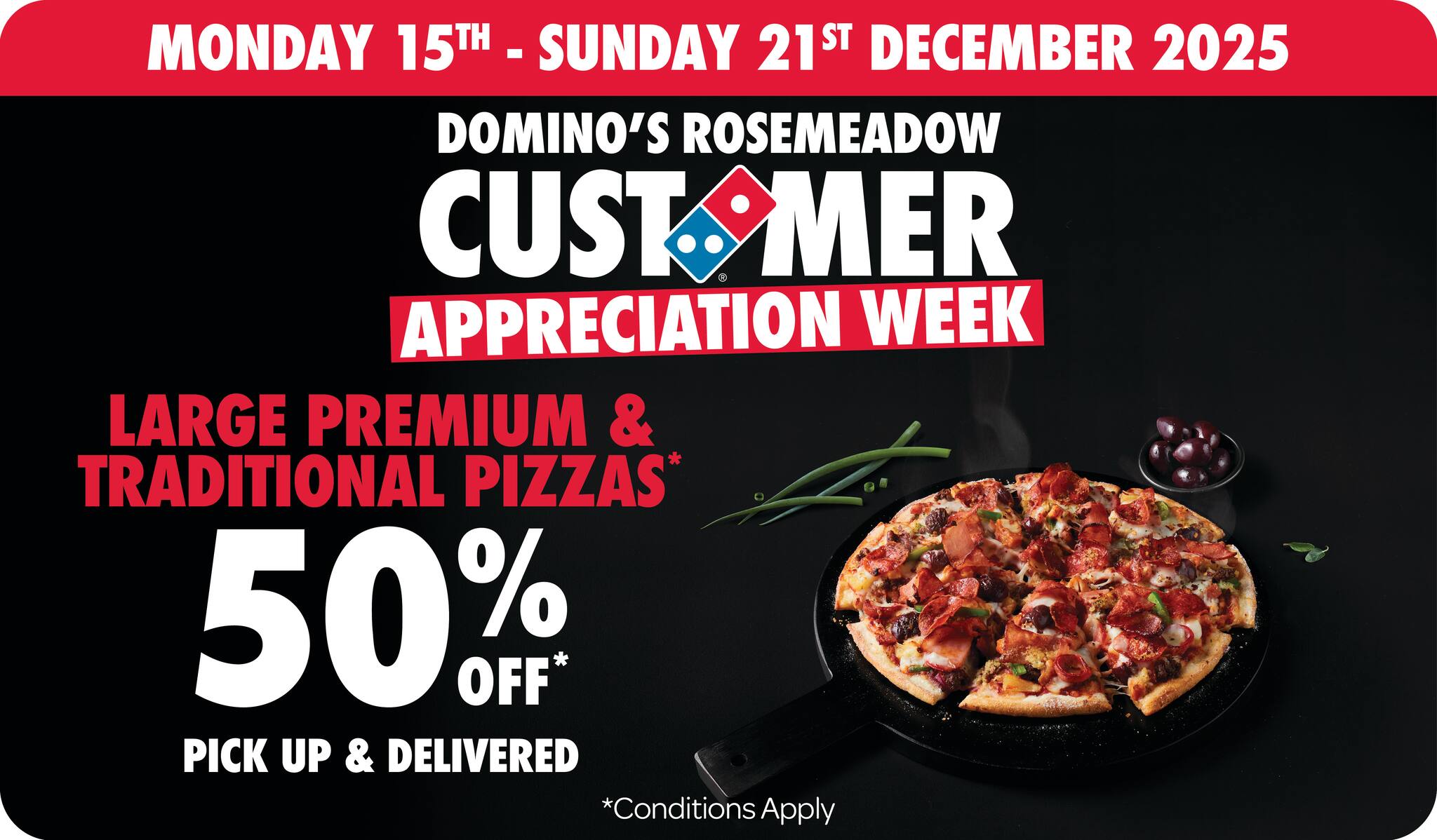 *10% surcharge applies on Sundays and after 10pm in selected stores. Surcharge of up to 20% applies on Public Holidays. Minimum delivery order $22.90 (excluding extended delivery, after 10pm, Sunday, and Public Holiday surcharges). Additional charges apply for extra toppings, half 'n' half & indulgent crusts. Limited area for delivery. For full terms and conditions click here.
