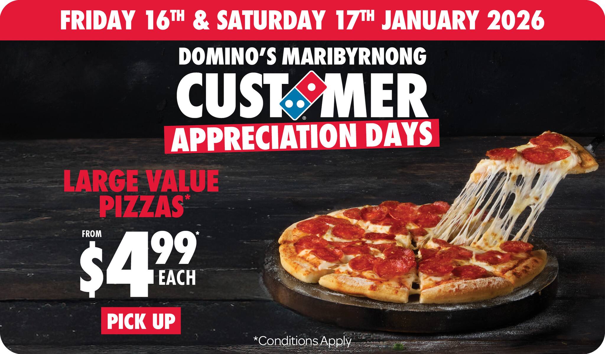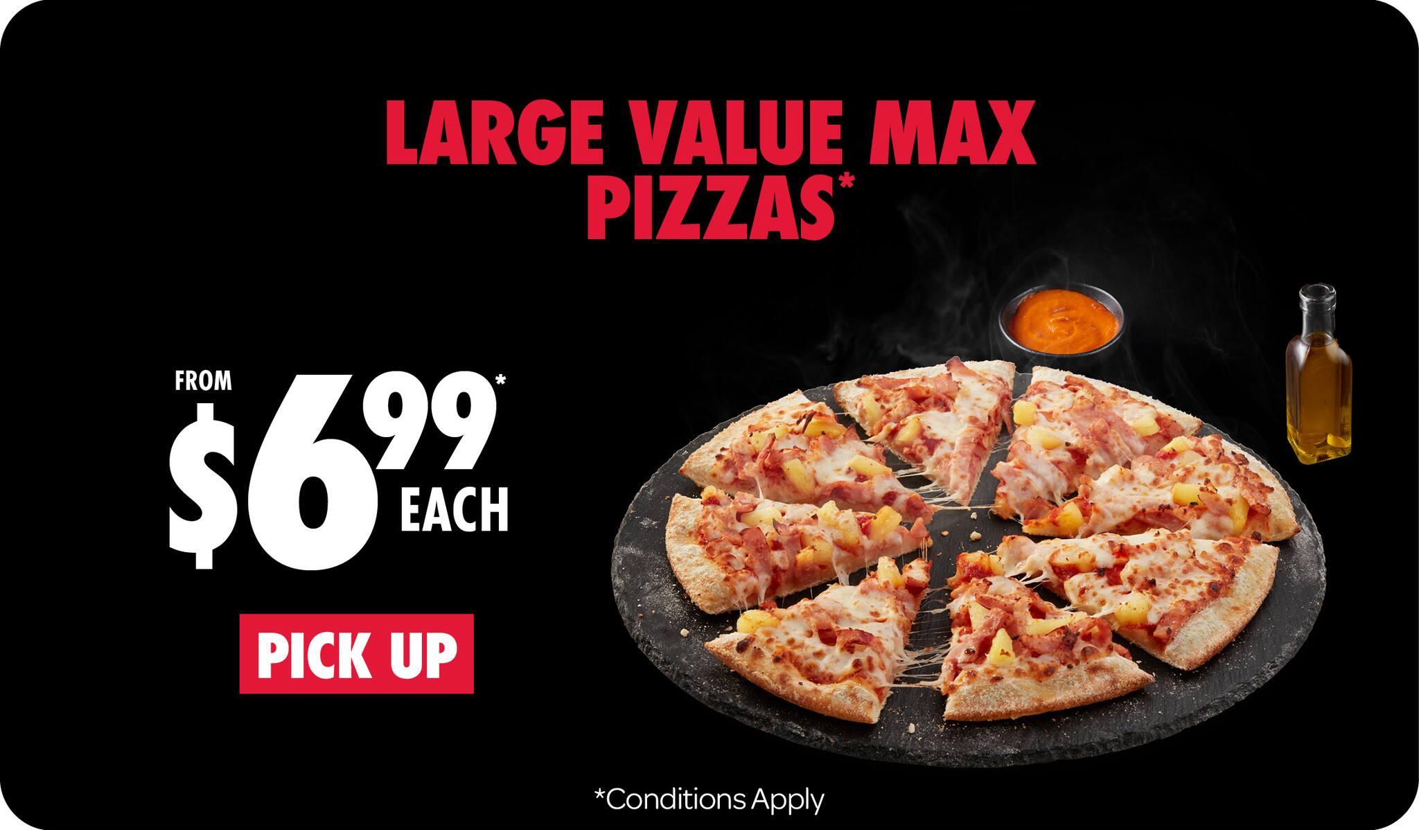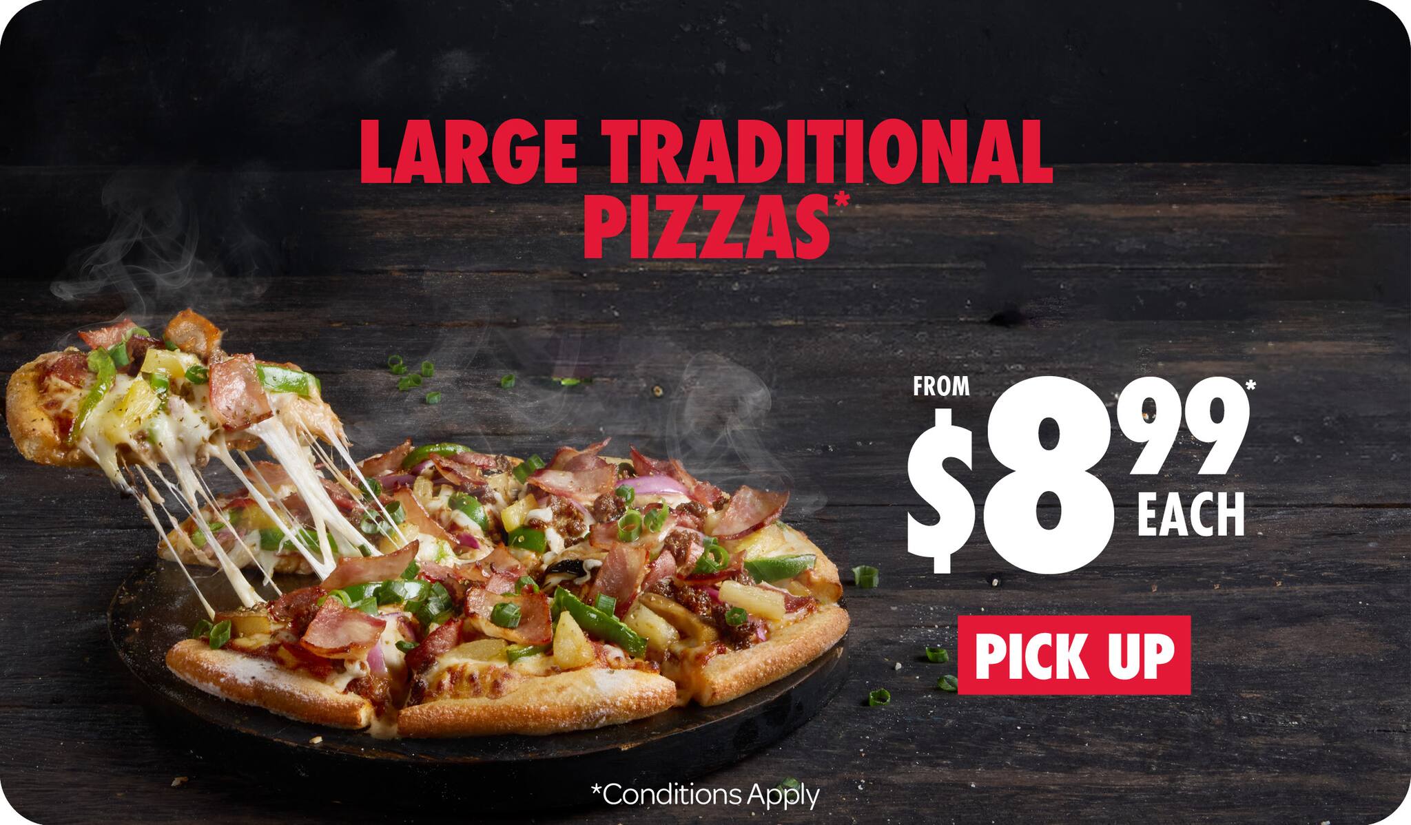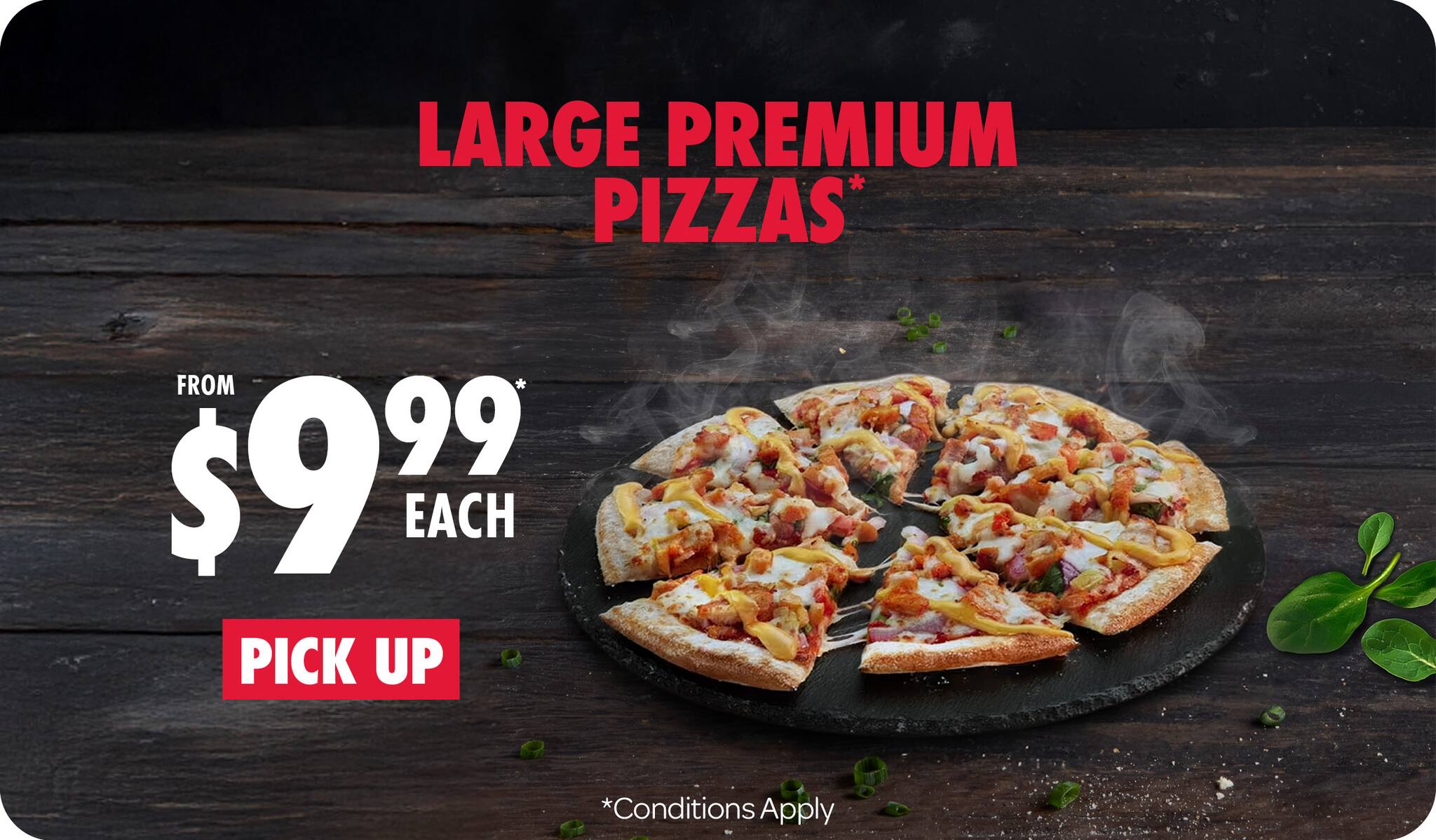 *10% surcharge applies on Sundays and after 10pm in selected stores. Surcharge of up to 20% applies on Public Holidays. Minimum delivery order $22.90 (excluding extended delivery, after 10pm, Sunday, and Public Holiday surcharges). Additional charges apply for extra toppings, half 'n' half & indulgent crusts. Limited area for delivery. For full terms and conditions click here.