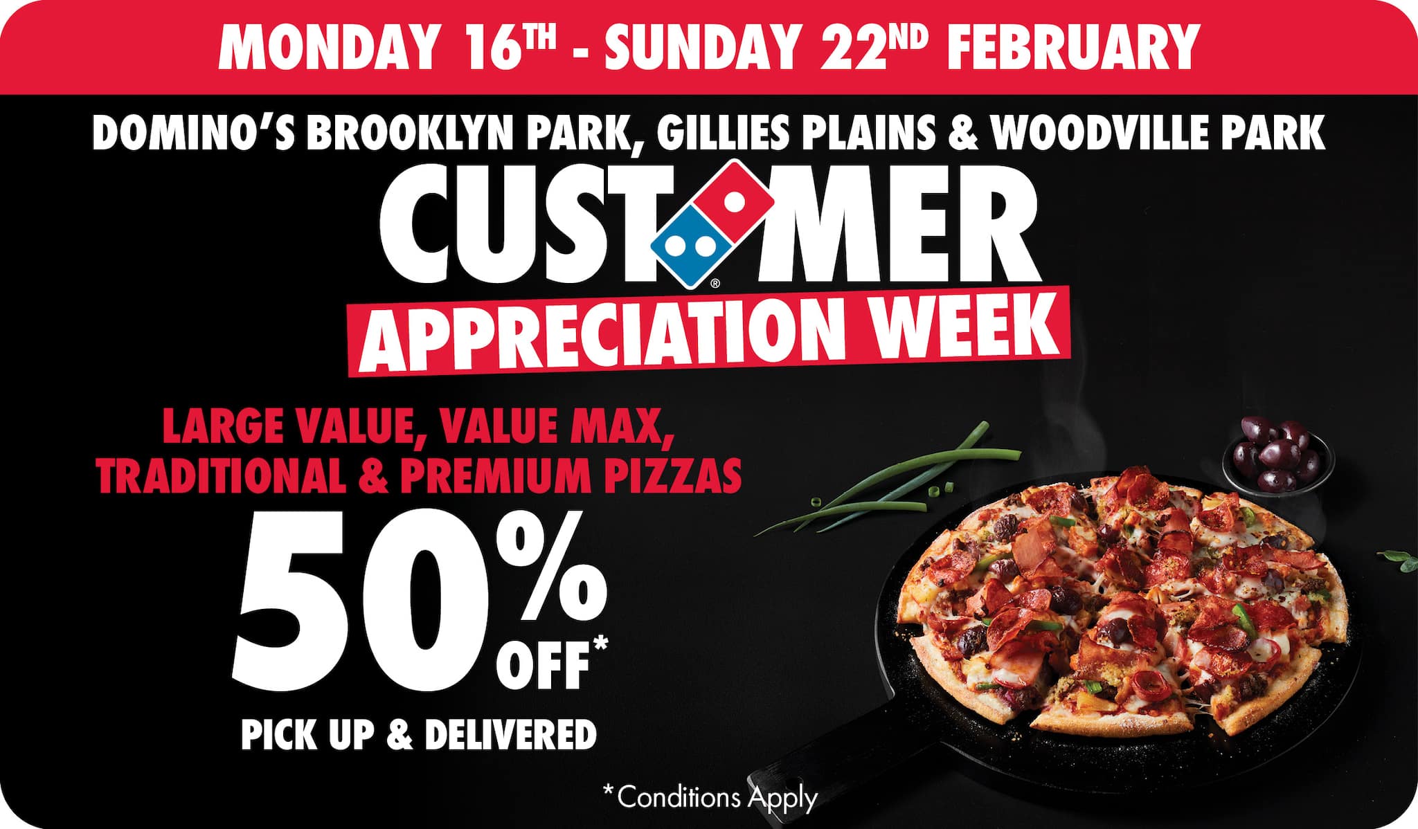 *10% surcharge applies on Sundays and after 10pm in selected stores. Surcharge of up to 20% applies on Public Holidays. Minimum delivery order $22.90 (excluding extended delivery, after 10pm, Sunday, and Public Holiday surcharges). Additional charges apply for extra toppings, half 'n' half & indulgent crusts. Limited area for delivery. For full terms and conditions click here.