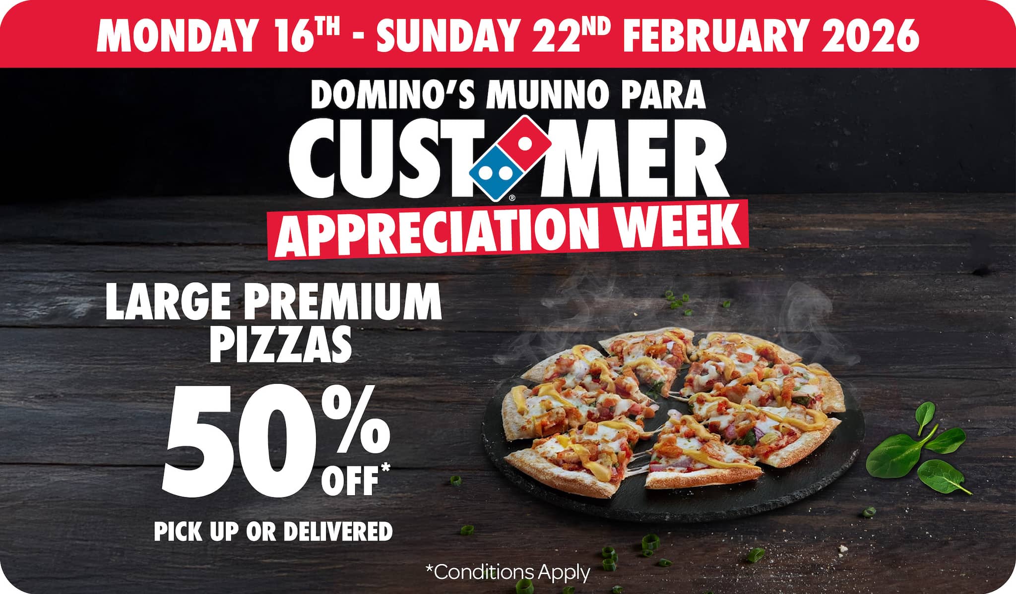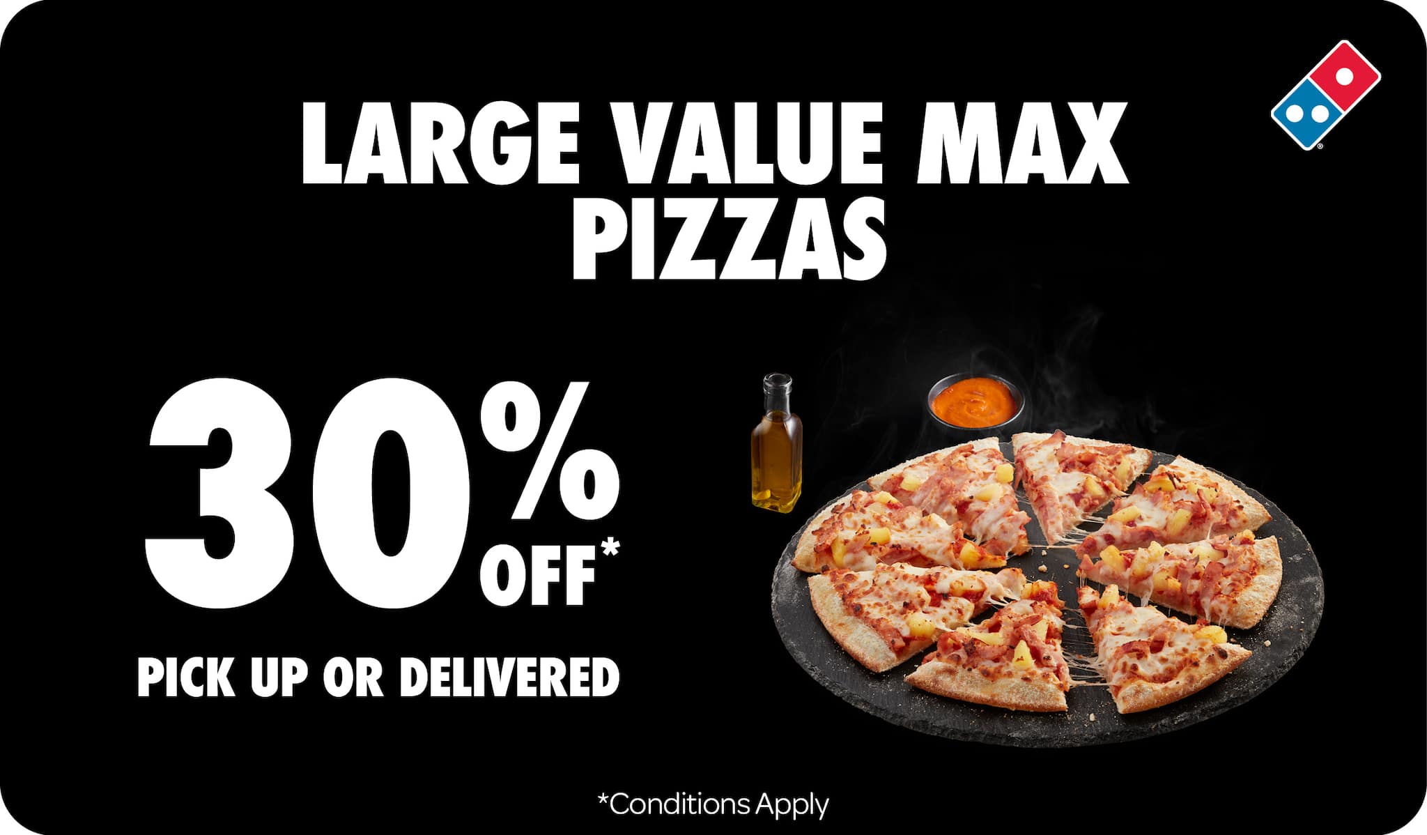 *10% surcharge applies on Sundays and after 10pm in selected stores. Surcharge of up to 20% applies on Public Holidays. Minimum delivery order $22.90 (excluding extended delivery, after 10pm, Sunday, and Public Holiday surcharges). Additional charges apply for extra toppings, half 'n' half & indulgent crusts. Limited area for delivery. For full terms and conditions click here.