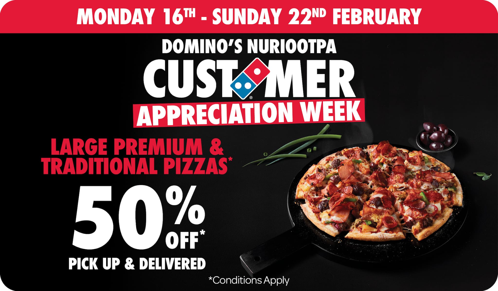 *10% surcharge applies on Sundays and after 10pm in selected stores. Surcharge of up to 20% applies on Public Holidays. Minimum delivery order $22.90 (excluding extended delivery, after 10pm, Sunday, and Public Holiday surcharges). Additional charges apply for extra toppings, half 'n' half & indulgent crusts. Limited area for delivery. For full terms and conditions click here.