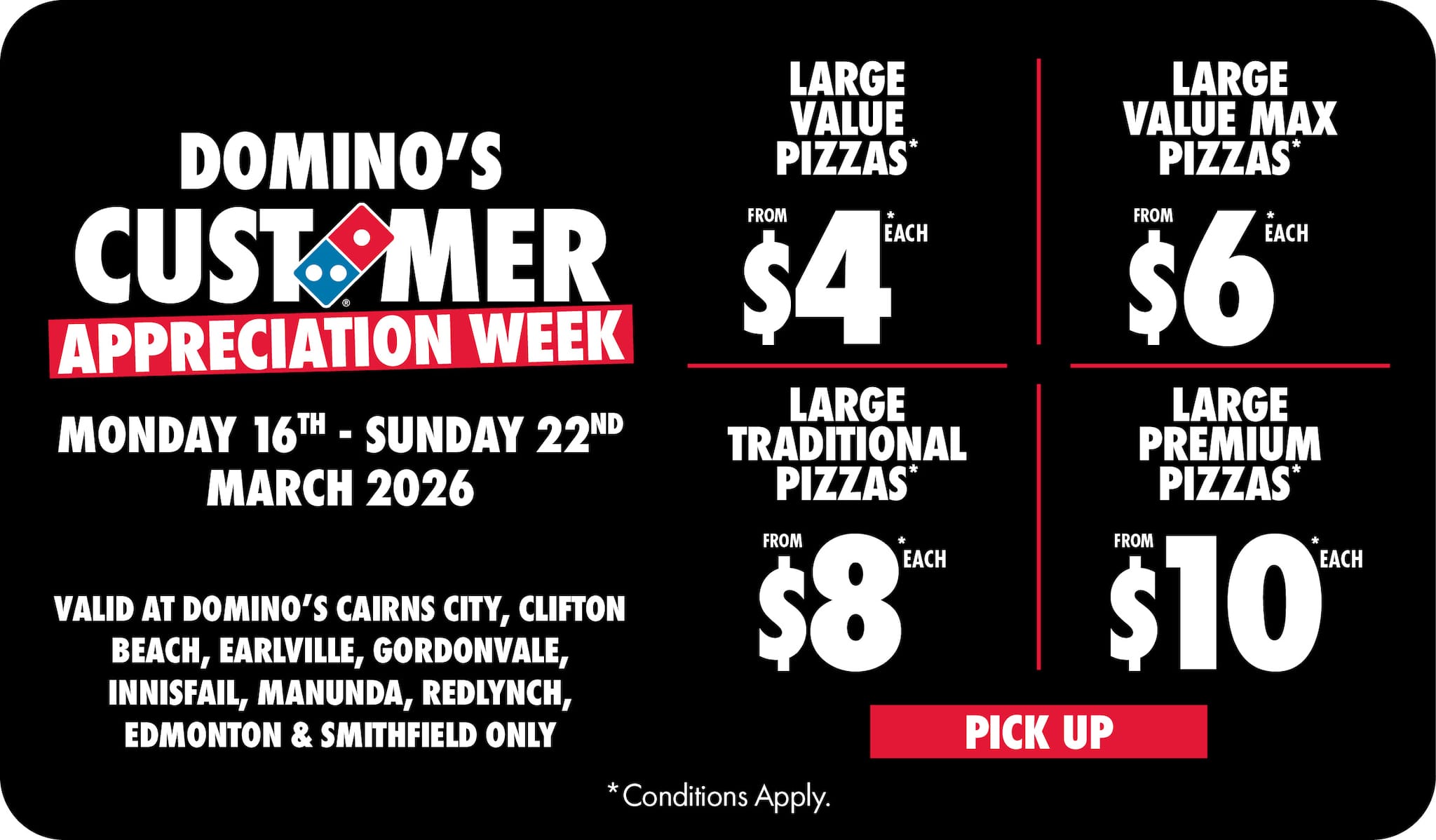 *10% surcharge applies on Sundays and after 10pm in selected stores. Surcharge of up to 20% applies on Public Holidays. Minimum delivery order $22.90 (excluding extended delivery, after 10pm, Sunday, and Public Holiday surcharges). Additional charges apply for extra toppings, half 'n' half & indulgent crusts. Limited area for delivery. For full terms and conditions click here.