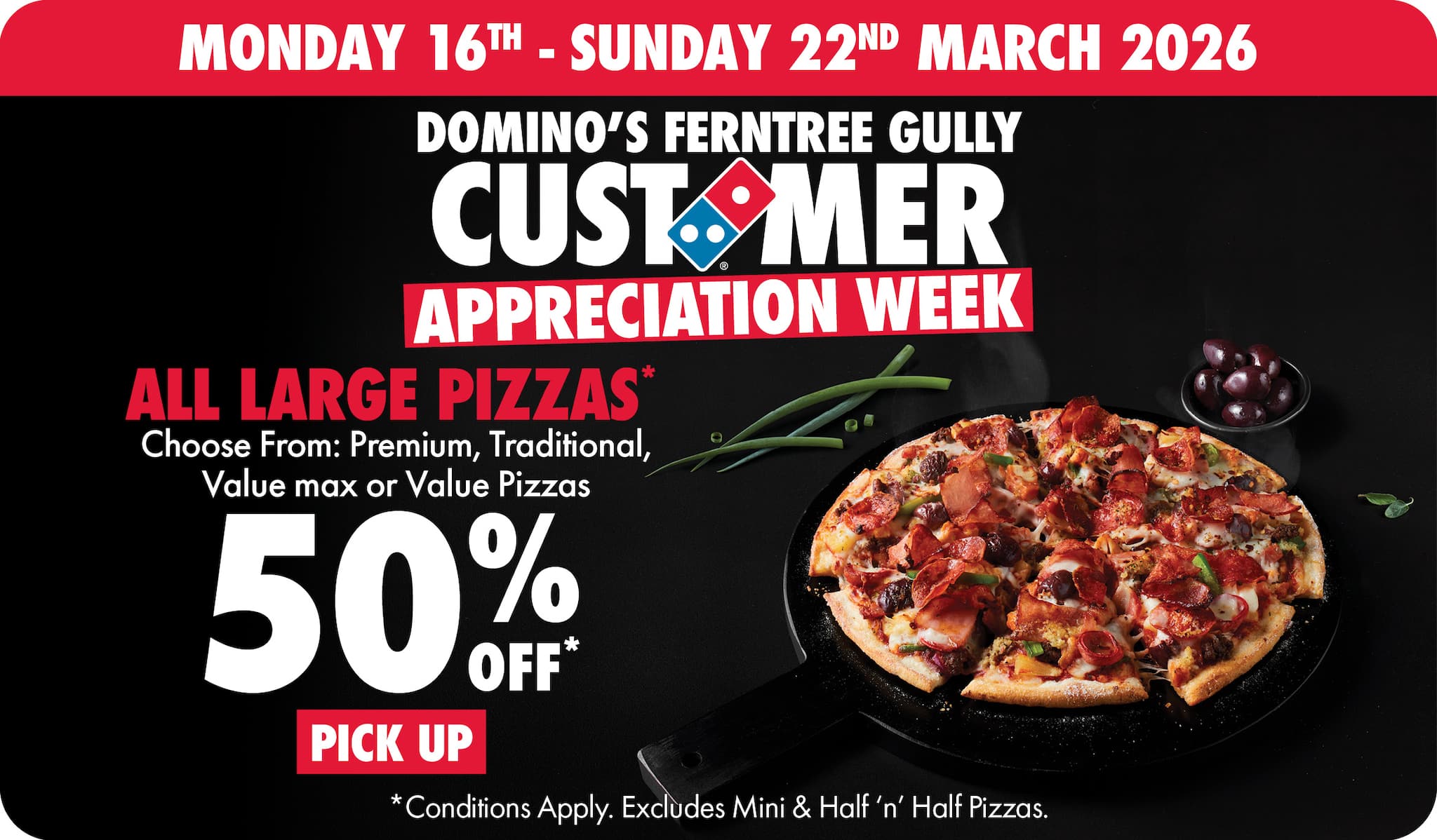 *10% surcharge applies on Sundays and after 10pm in selected stores. Surcharge of up to 20% applies on Public Holidays. Minimum delivery order $22.90 (excluding extended delivery, after 10pm, Sunday, and Public Holiday surcharges). Additional charges apply for extra toppings, half 'n' half & indulgent crusts. Limited area for delivery. For full terms and conditions click here.