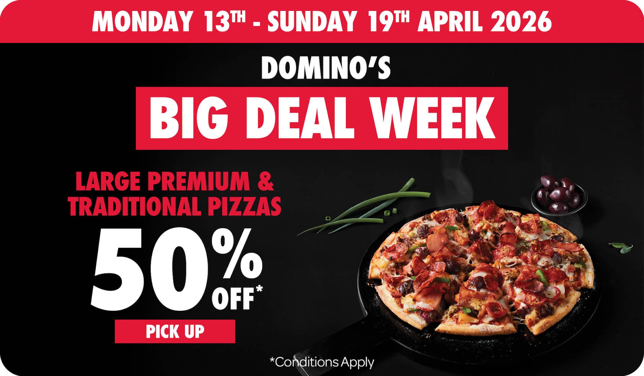 *10% surcharge applies on Sundays and after 10pm in selected stores. Surcharge of up to 20% applies on Public Holidays. Minimum delivery order $22.90 (excluding extended delivery, after 10pm, Sunday, and Public Holiday surcharges). Additional charges apply for extra toppings, half 'n' half & indulgent crusts. Limited area for delivery. For full terms and conditions click here.