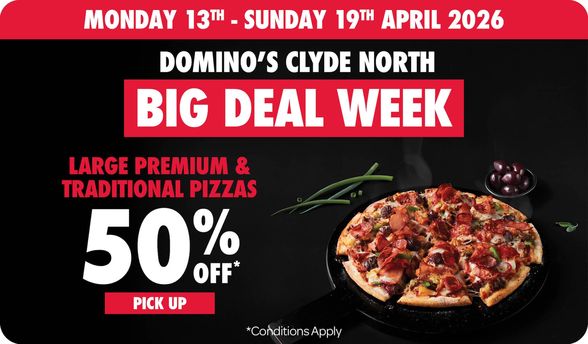 *10% surcharge applies on Sundays and after 10pm in selected stores. Surcharge of up to 20% applies on Public Holidays. Minimum delivery order $22.90 (excluding extended delivery, after 10pm, Sunday, and Public Holiday surcharges). Additional charges apply for extra toppings, half 'n' half & indulgent crusts. Limited area for delivery. For full terms and conditions click here.