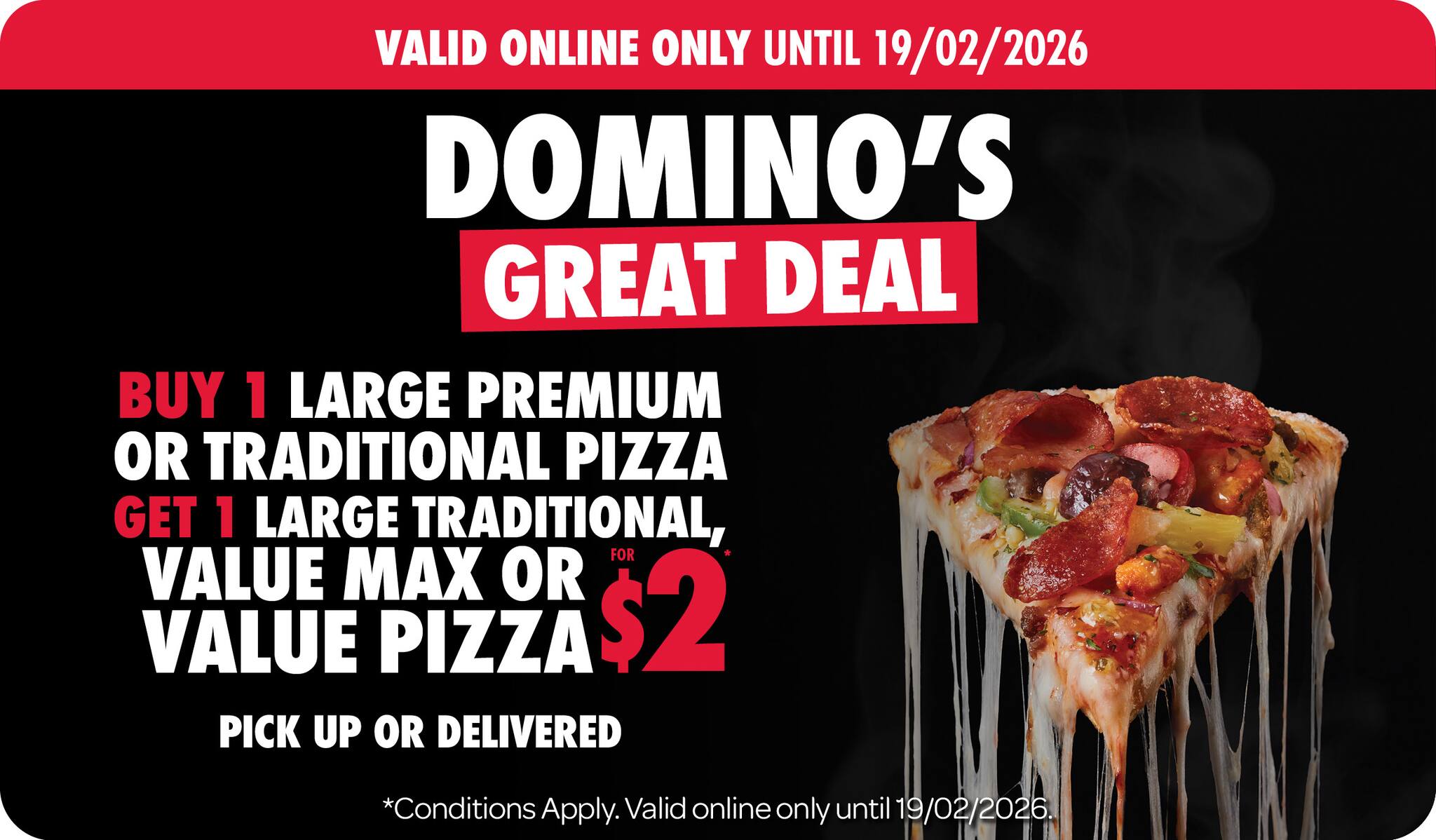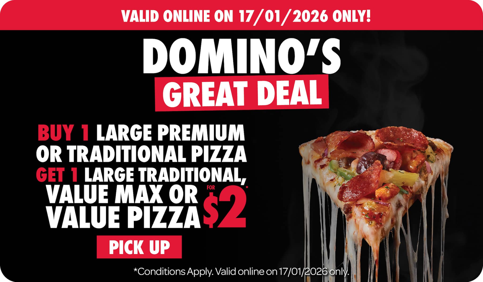 *10% surcharge applies on Sundays and after 10pm in selected stores. Surcharge of up to 20% applies on Public Holidays. Minimum delivery order $22.90 (excluding extended delivery, after 10pm, Sunday, and Public Holiday surcharges). Additional charges apply for extra toppings, half 'n' half & indulgent crusts. Limited area for delivery. For full terms and conditions click here.