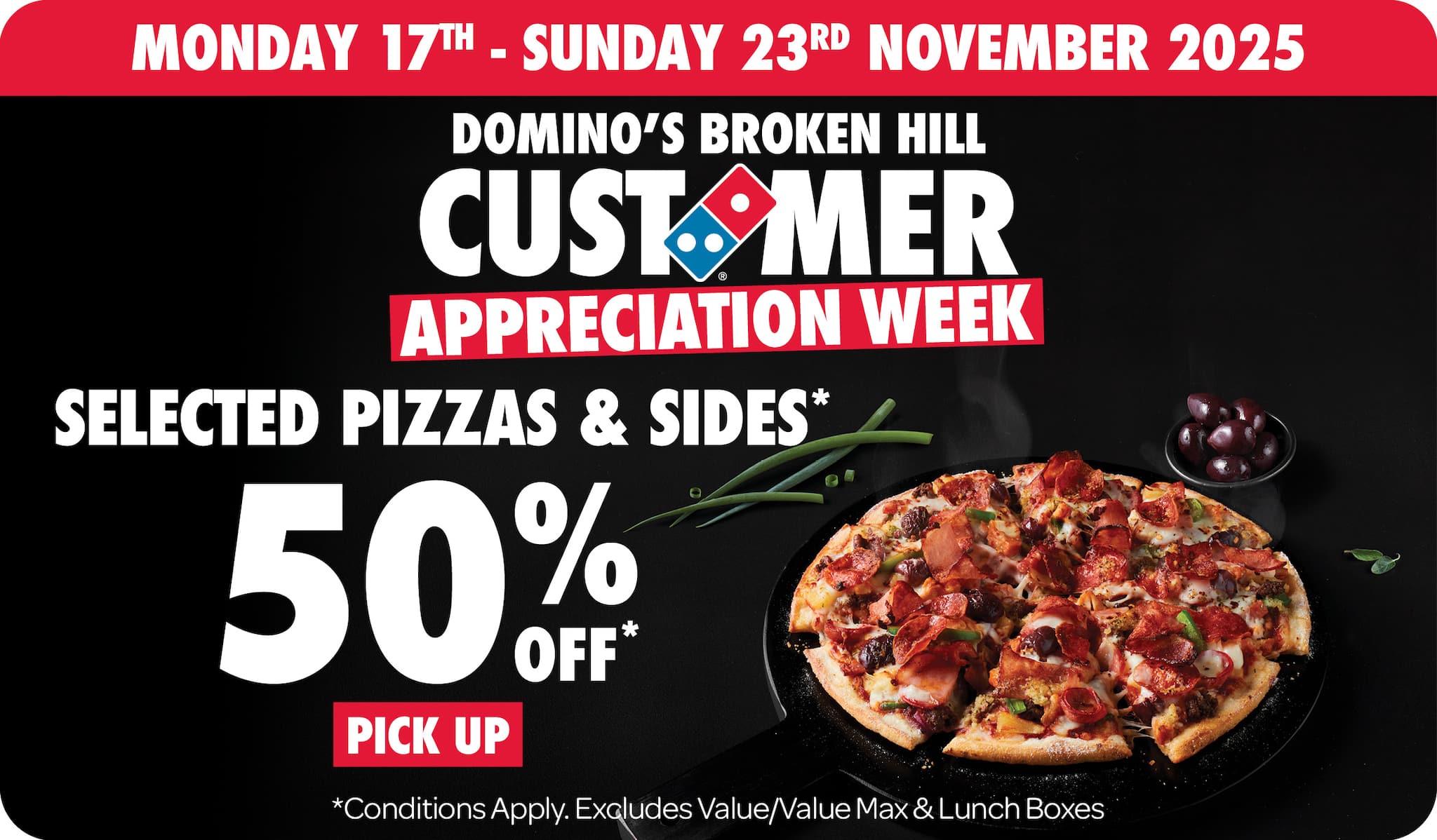 *10% surcharge applies on Sundays and after 10pm in selected stores. Surcharge of up to 20% applies on Public Holidays. Minimum delivery order $22.90 (excluding extended delivery, after 10pm, Sunday, and Public Holiday surcharges). Additional charges apply for extra toppings, half 'n' half & indulgent crusts. Limited area for delivery. For full terms and conditions click here.